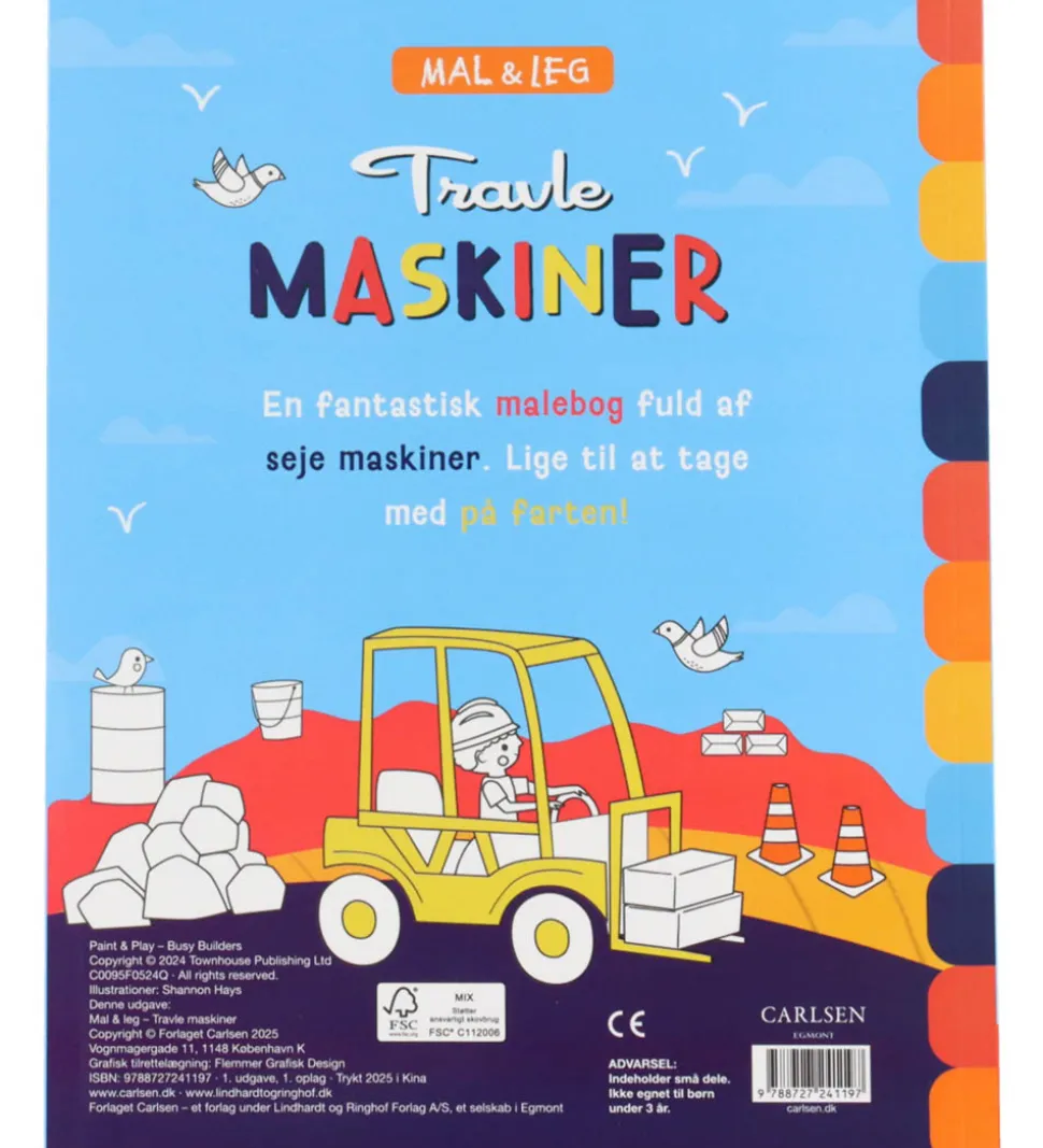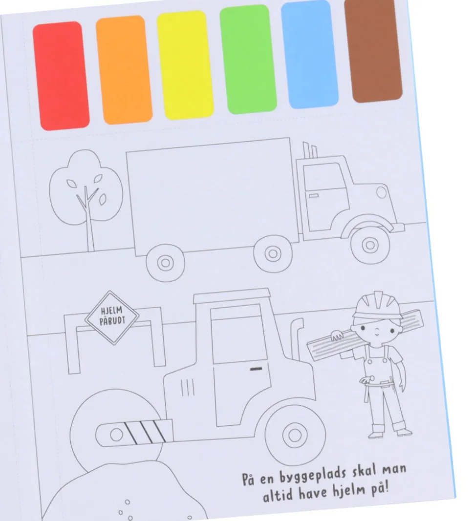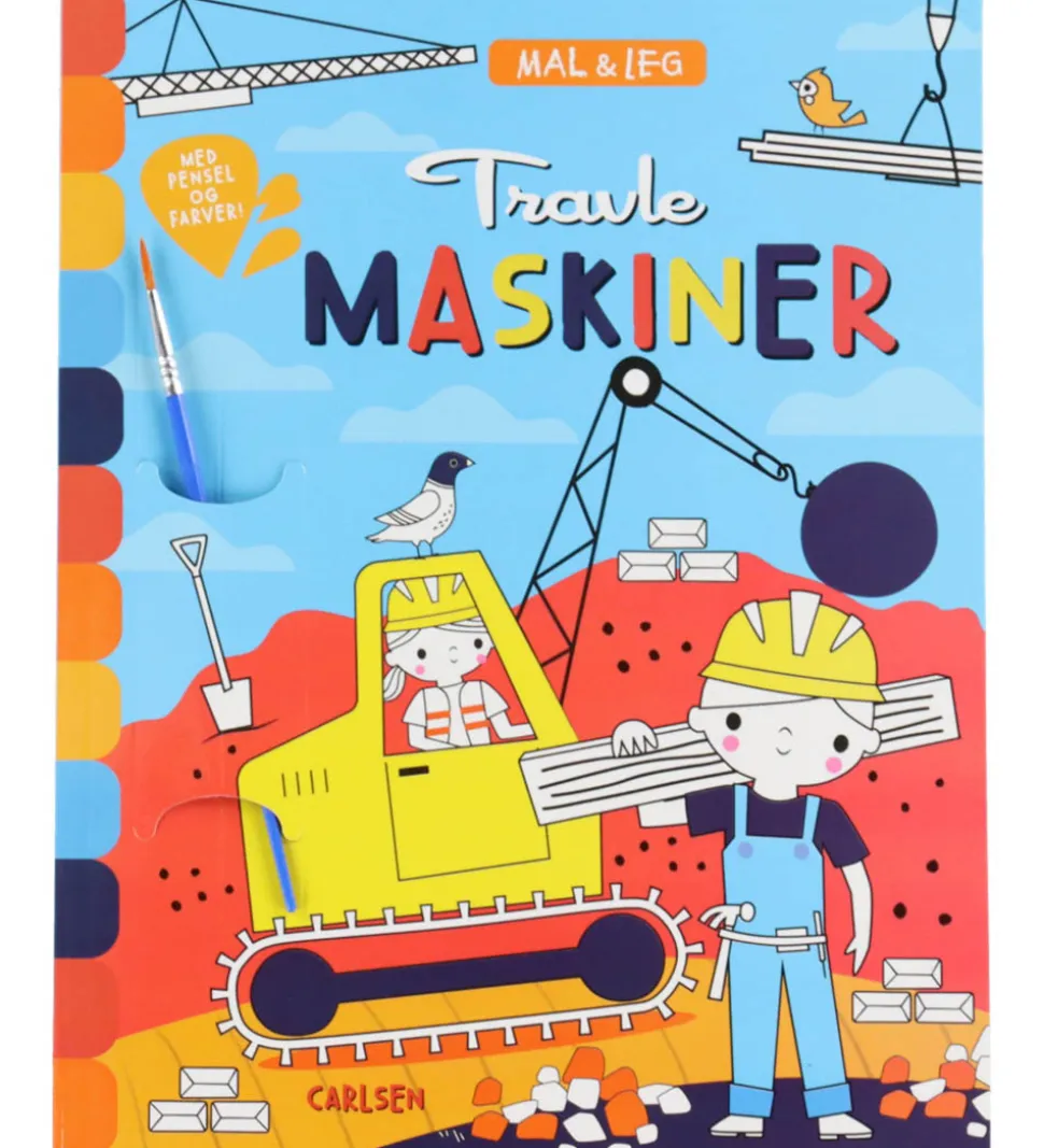 Forlaget Carlsen malebogen indeholder forskellige motiver med arbejdsmaskiner, en pensel og seks forskellige vandfarver, som er placeret på hver side i malebogen. Forlaget Carlsen malebogen inspirerer til kreativ udfoldelse.