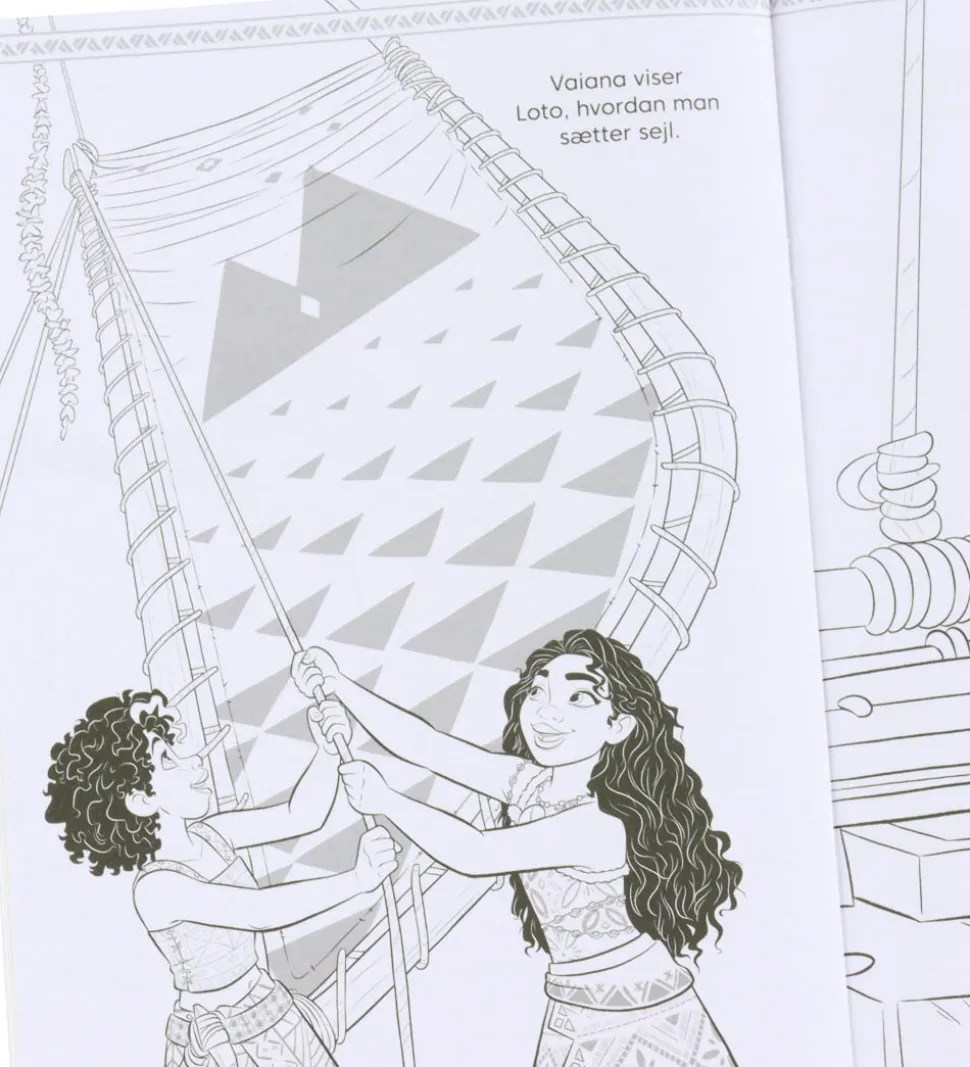 Malebogen indeholder fine illustrationer fra Vaiana-universet samt klistermærker til at pynte de mange flotte sider. Perfekt til fans af Disneys eventyrlige univers.