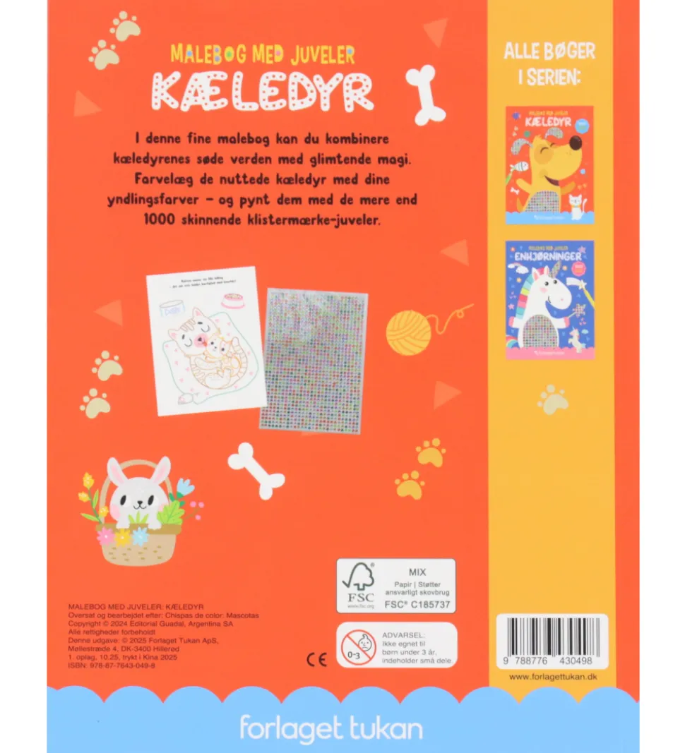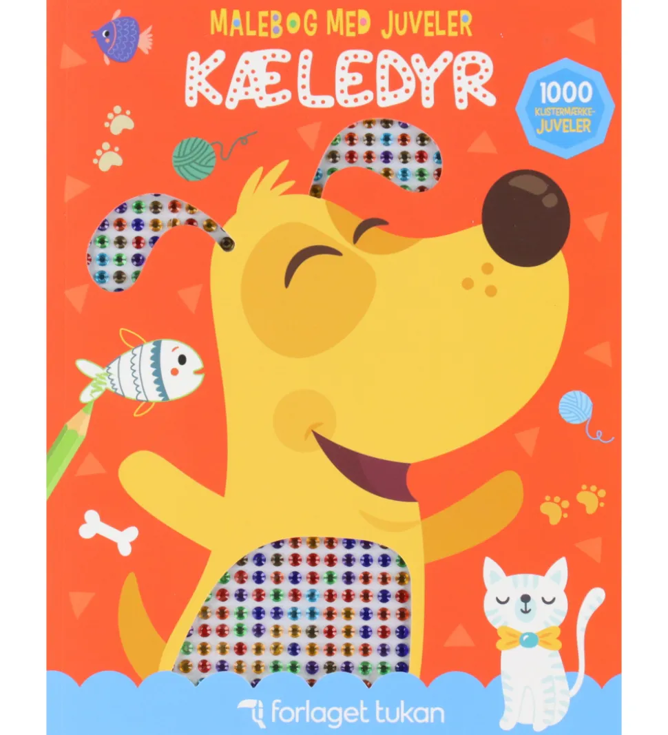 Skøn Forlaget Tukan malebog med titlen “Malebog med juveler – Kæledyr”. Malebogen indeholder korte tekster og fine illustrationer, som skal farvelægges. Der medfølger 1000 klistermærke-juveler, som kan gøre tegningerne endnu flottere.