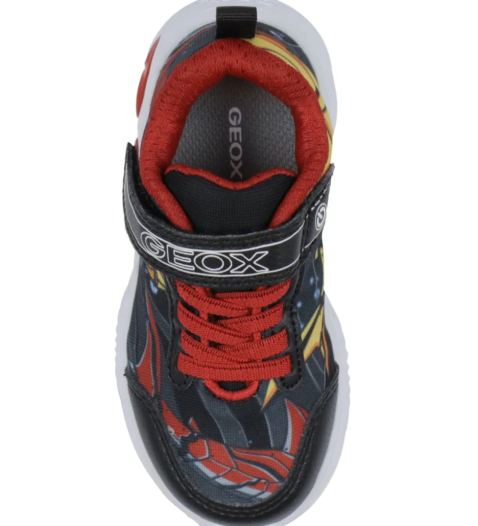 Smarte Geox blinkesko i sort og rød med print af hajer i gule og røde nuancer.