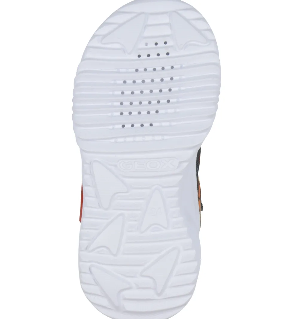Geox skoene har elastiske snøre over vristen og lukkes med en bred velcrorem øverst. Bagtil er der en praktisk strop, som kan være behjælpelig, når man skal have skoene på. Indvendigt er der rødt mesh og udtagelige indersåler med små ventilationshuller.