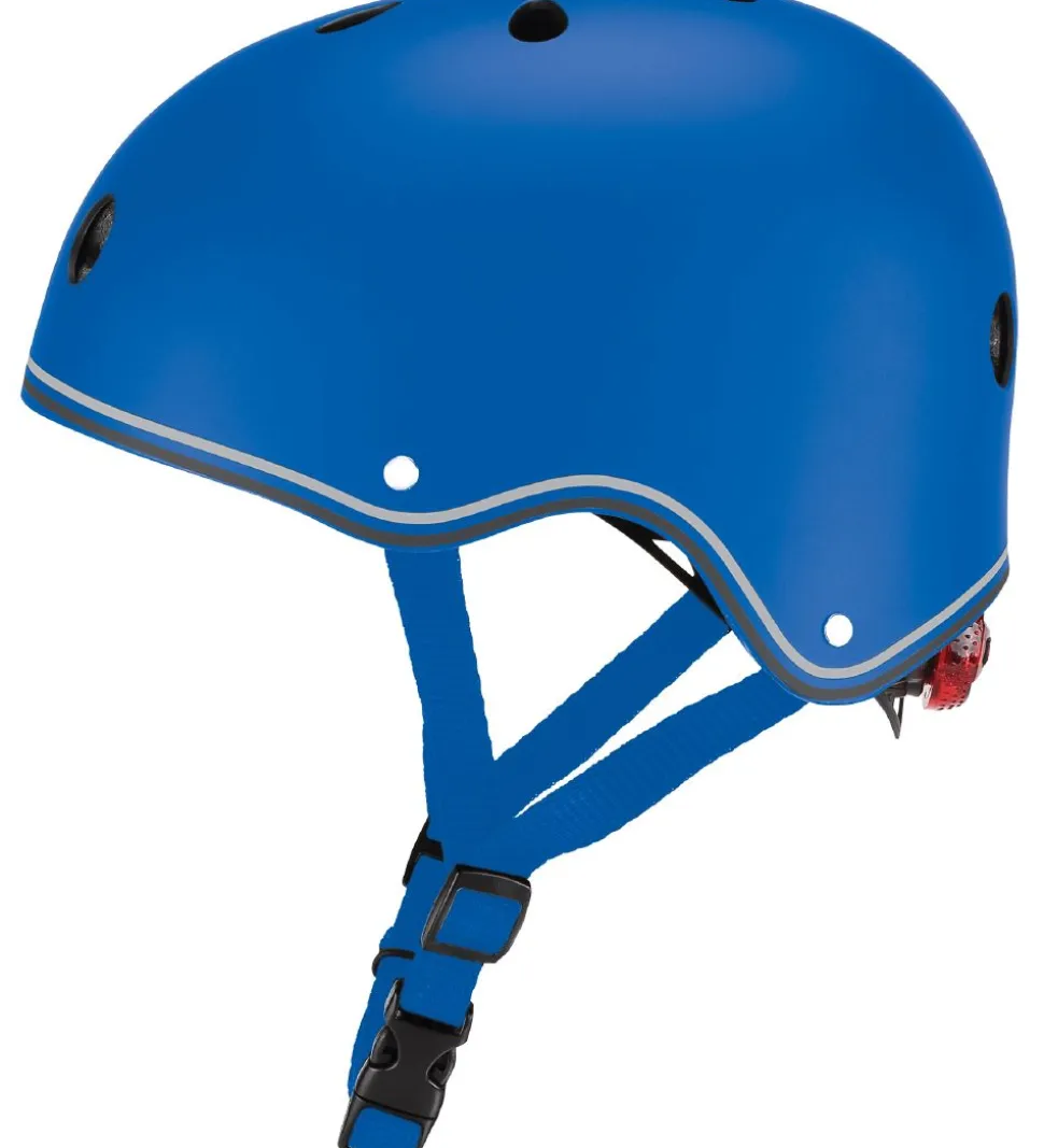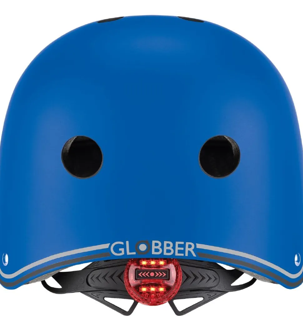 Globber cykelhjelmen spændes under hagen med justerbare remme og en praktisk plastikspænde. Hjelmen kan ligeledes spændes ind i nakken, hvor der sidder en rød LED-lampe, som kan tændes for ekstra synlighed i trafikken. Cykelhjelmen har bløde fleecepuder indeni, og i toppen, bagpå og fortil er der praktiske lufthuller, for en god ventilation.