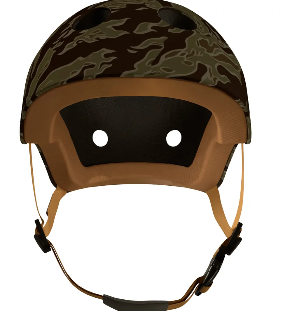 Sej Globe hjelm i sort, grøn og brune nuancer i et camouflage-mønster med en mat overflade og med et gult logoprint bagpå.