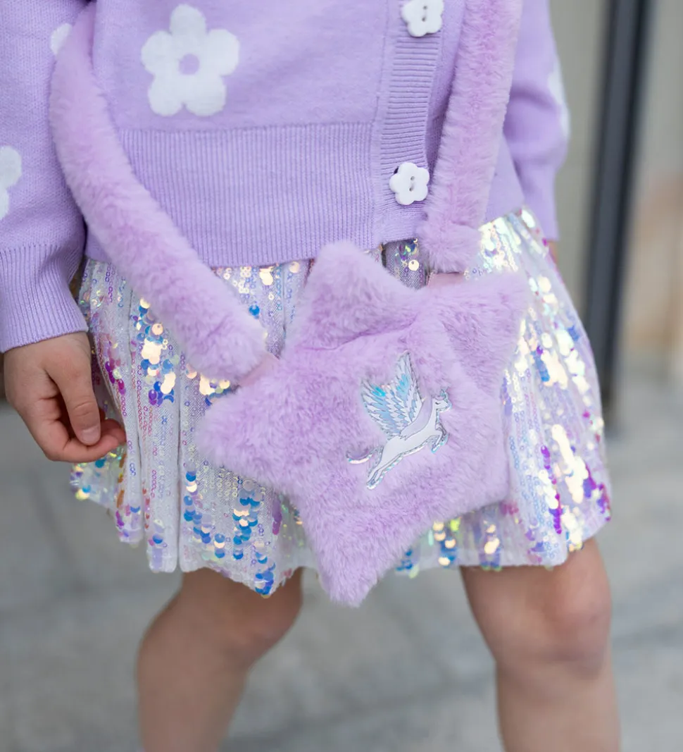 Flot Great Pretenders udklædning i form af en nederdel med metalliske pailletter i hvid og lilla. Great Pretenders udklædningen er med elastikkant i livet og på indersiden har den et lag af hvidt tyl.