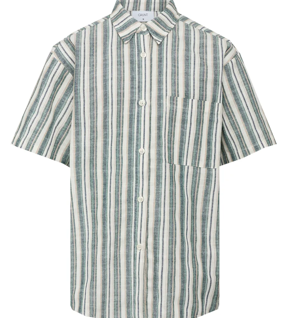 Sej Grunt skjorte med lodrette striber i grønne, brune og hvide nuancer.