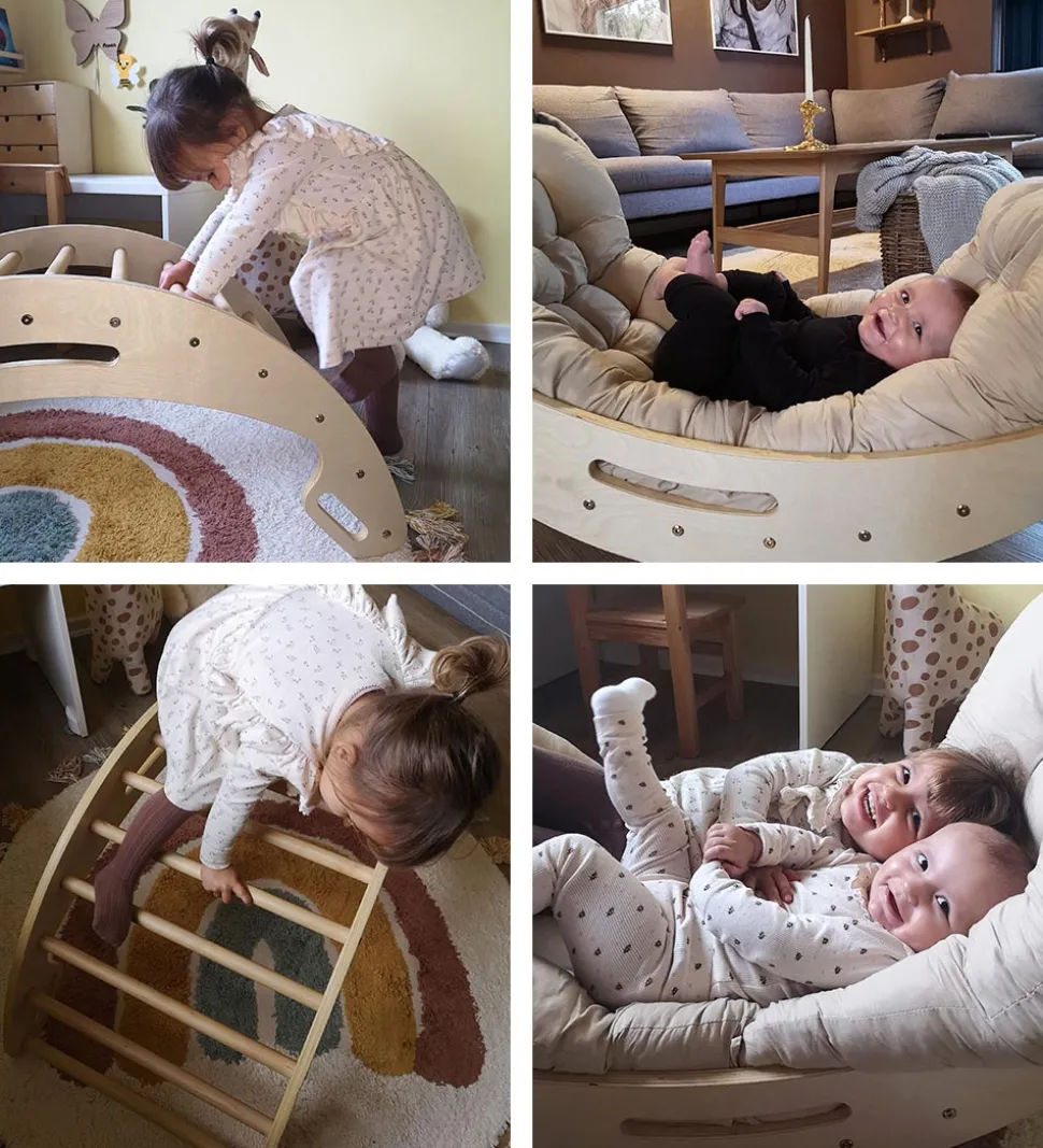 Hemmningsen klatrebuen har mange forskellige funktioner – det er kun fantasien, der sætter grænser. Den kan f.eks. bruges som et klatrelegetøj, en skammel eller en lille hule med et tæppe over, eller den kan vendes rundt, så den kan bruges som vippe eller som en hyggelig vugge for både store og små. Klatrebuen kan kombineres med klatrestativet fra Hemmingsen Kids, og den er med til at udvikle barnets eller den vendes rundt kan bruges som stol, vippe, klatrestativ. Den er med til at udvikle barnets motorik.