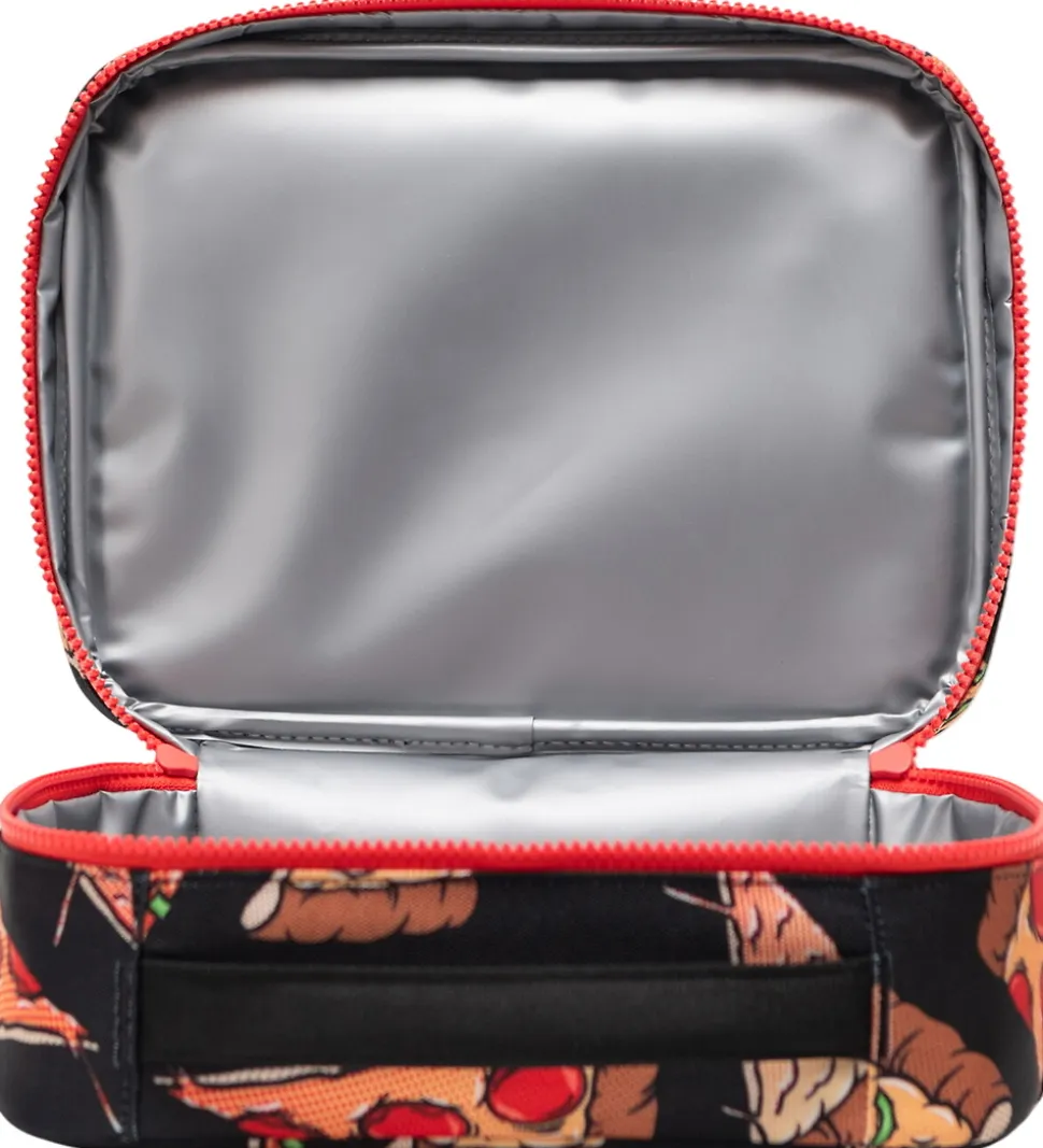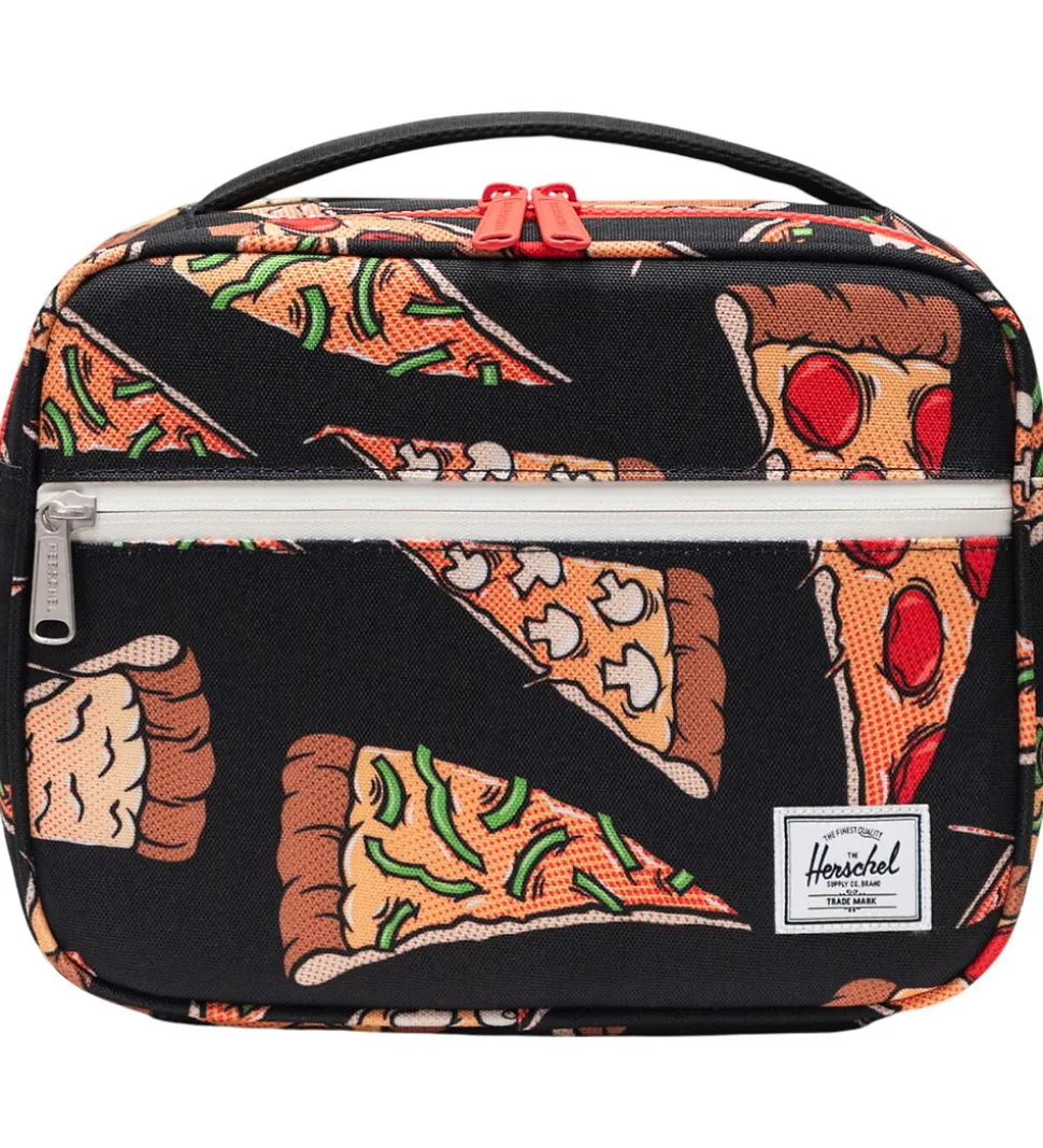 Praktisk Herschel køletaske i sort med allover-pizzaprint.
