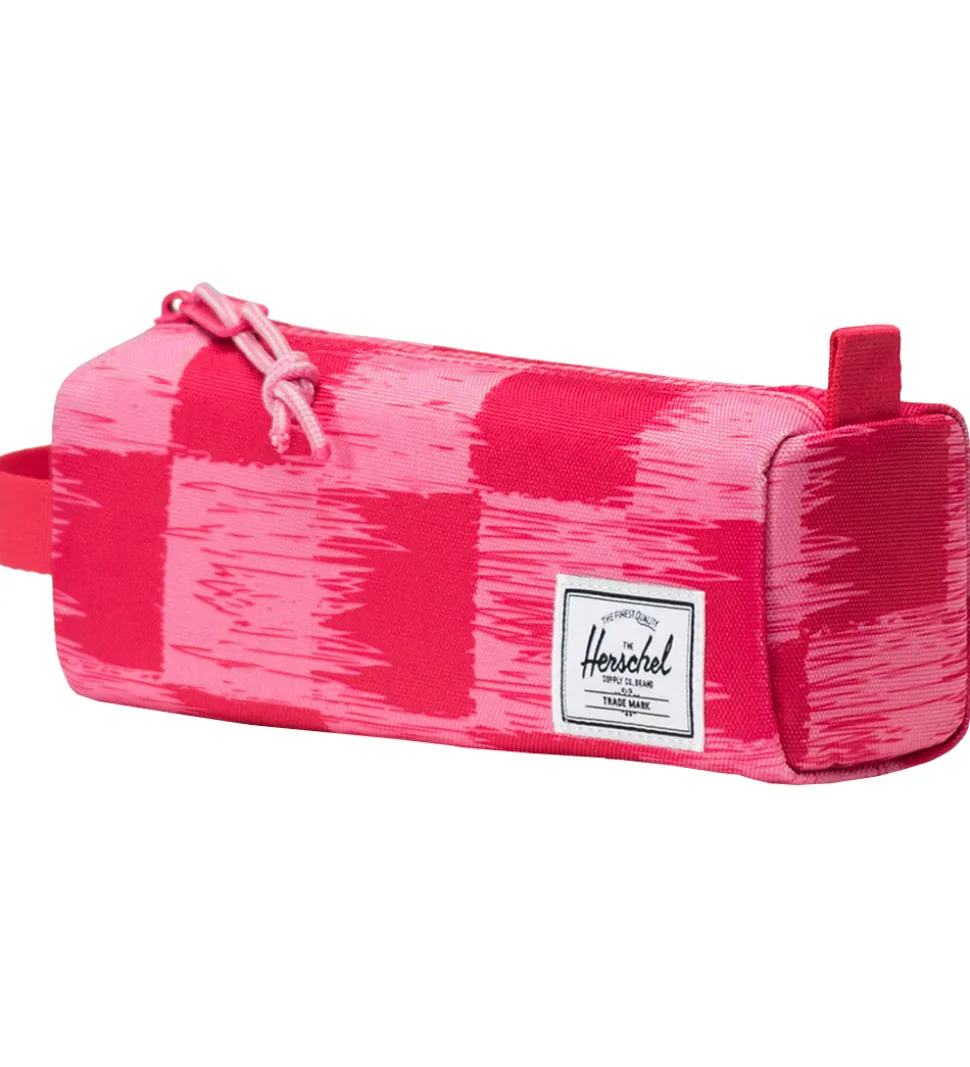 Sejt Herschel penalhus i rosa og pink i et ternet mønster. Penalhuset består af ét stort rum, som åbnes med lynlås. Penalhuset har et hvidt navneskilt og et håndtag, så den er nem at have med på farten.