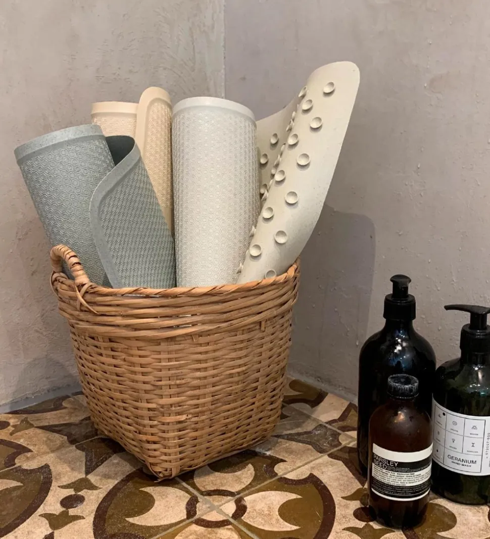 Bademåtten minimerer risikoen for at man skrider i badet eller på gulvet når det er vådt. Måtten har 299 sugekopper på undersiden, og på overfladen er der et mønster med sekskanter som giver et skridsikkert fodfæste.