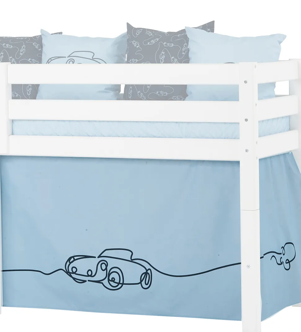 Hoppekids forhænget passer til den halvhøje seng fra Hoppekids, og det forvandler området under sengen til en hyggelig hule. Forhænget består af to endestykker samt et større stykke, som dækker den ene langside hen til stigen op til sengen.