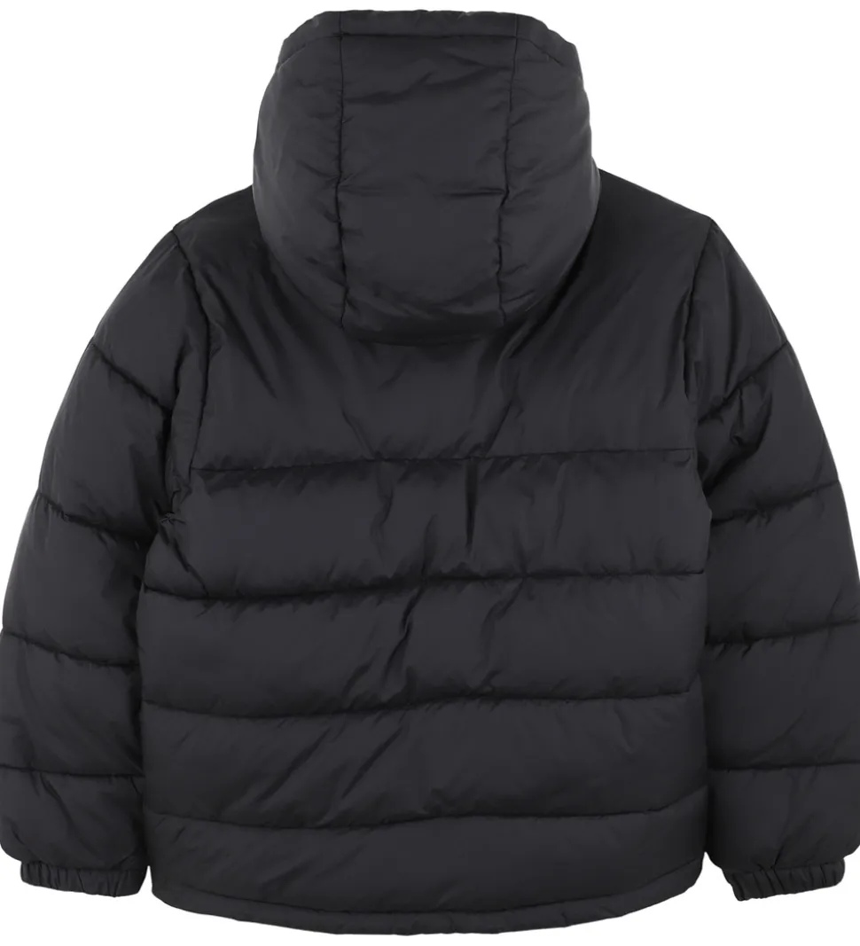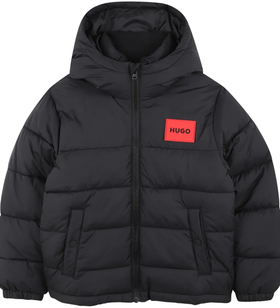 Flot HUGO dynejakke i ensfarvet sort med et rødt logo på brystet. Dynejakken har en fast hætte, og ærmerne har elastikkanter.