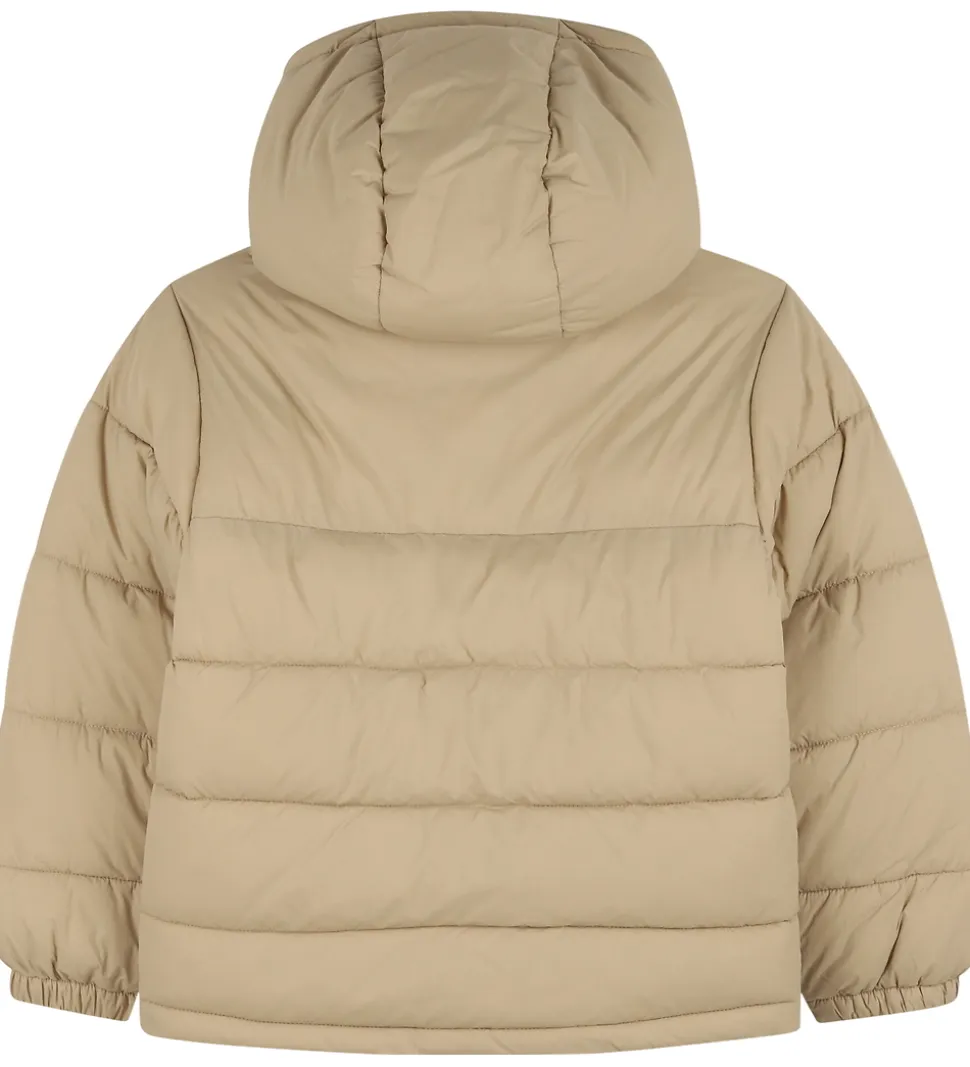 Lækker HUGO dynejakke i ensfarvet beige nuance med et rødt logo på brystet. Dynejakken har en fast hætte, og ærmerne har elastikkanter.