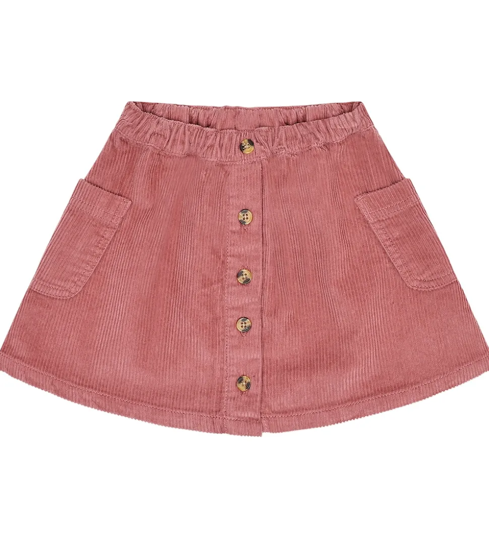 Elegant Hust and Claire nederdel i en varm, rosa farve med blød fløjlstruktur. Hust and Claire nederdelen har en juster, elastisk talje og knapper fortil. Den har praktiske lommer på siderne.