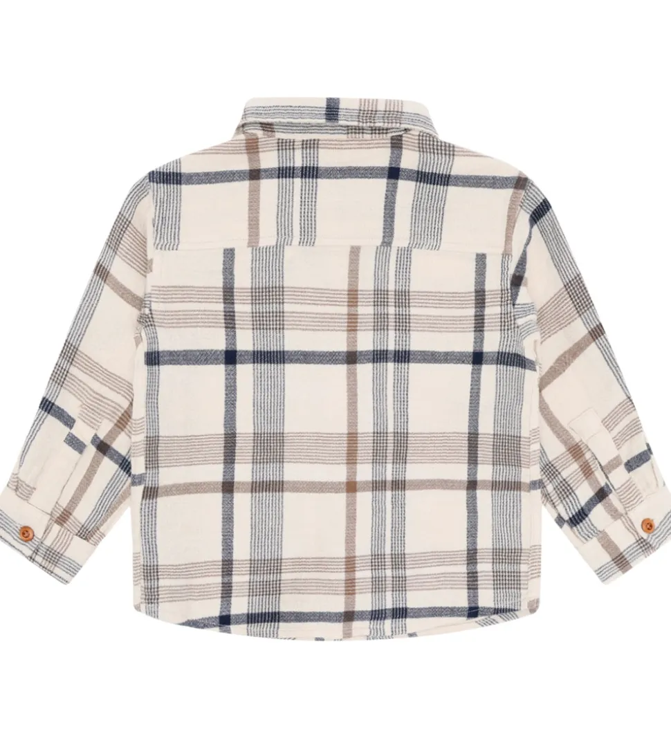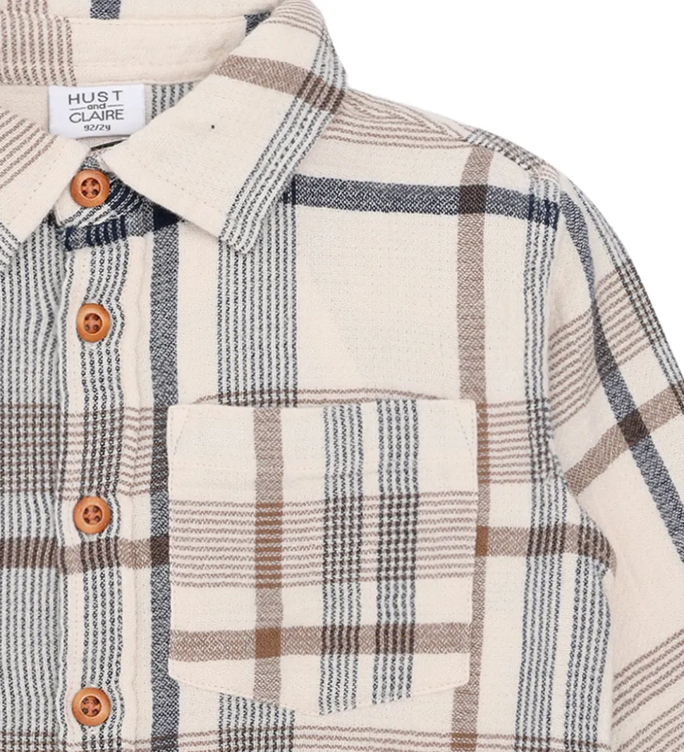 Flot Hust and Claire skjorte i creme med et ternet mønster i brun og navy. Skjorten har lange ærmer med brede kanter og en enkelt manchetknap, og i halsåbningen har den en klassisk krave. Skjorten har en brystlomme i venstre side, og den lukkes med brune knapper.