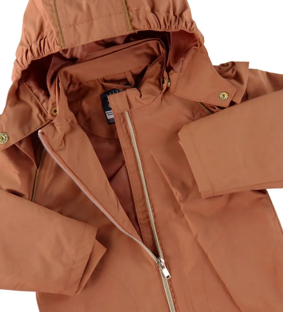 Fin Hust and Claire sommerjakke i en lys, brun nuance med omkring skuldrene og på hætten.