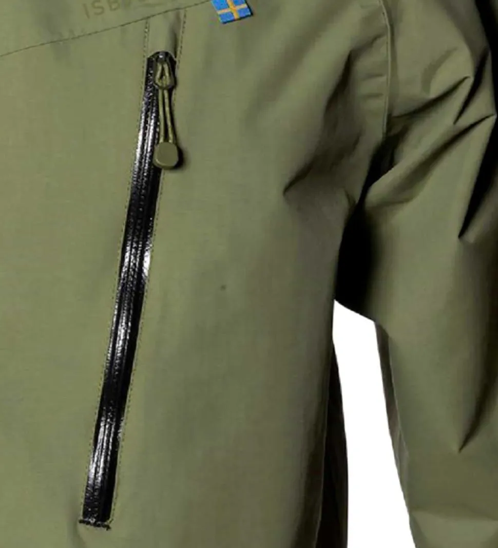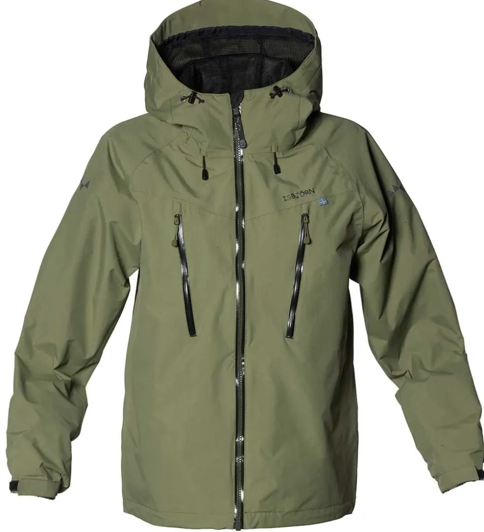 Lækker Isbjörn Of Sweden skaljakke i armygrøn med sorte lynlåse. Skaljakken har sorte logoprint på venstre bryst og hætten samt smarte refleksprint på lænden og begge skuldre.