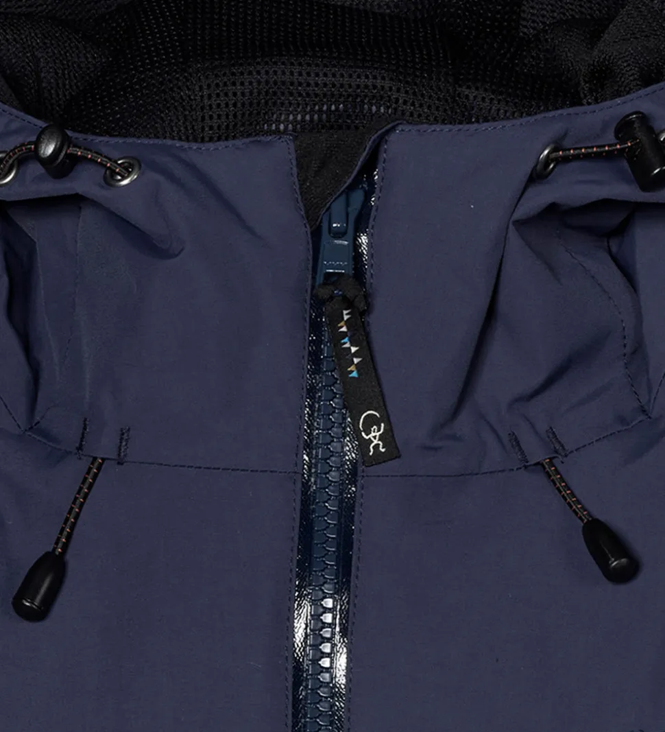 Skaljakken har to vertikale brystlommer med lynlåslukninger. I livåbningen har skaljakken en indvendigt justerbar elastikkant.