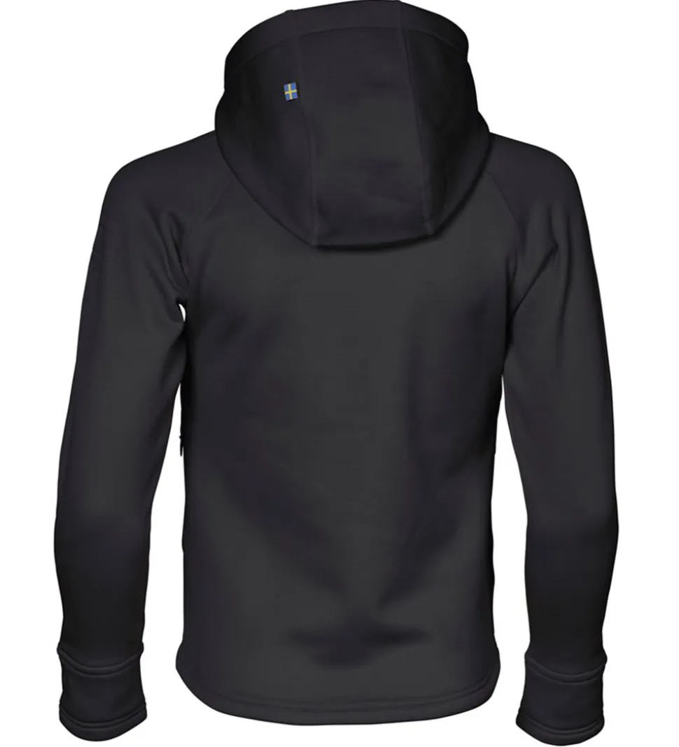 Isbjörn Of Sweden softshelljakken har en fast hætte med en høj hals og lange ærmer med brede kanter, hvor der også er et lille hul i tommelfingeren. Softshelljakken åbnes fortil ved hjælp af en lynlås med hagebeskytter og indvendig vindstolpe.