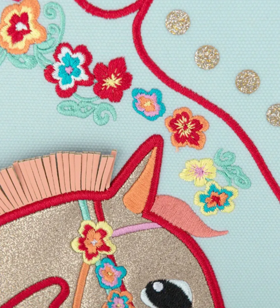 Fin Jeune Premier børnehavetaske i lyseblå med et flot og farverigt hesteprint.