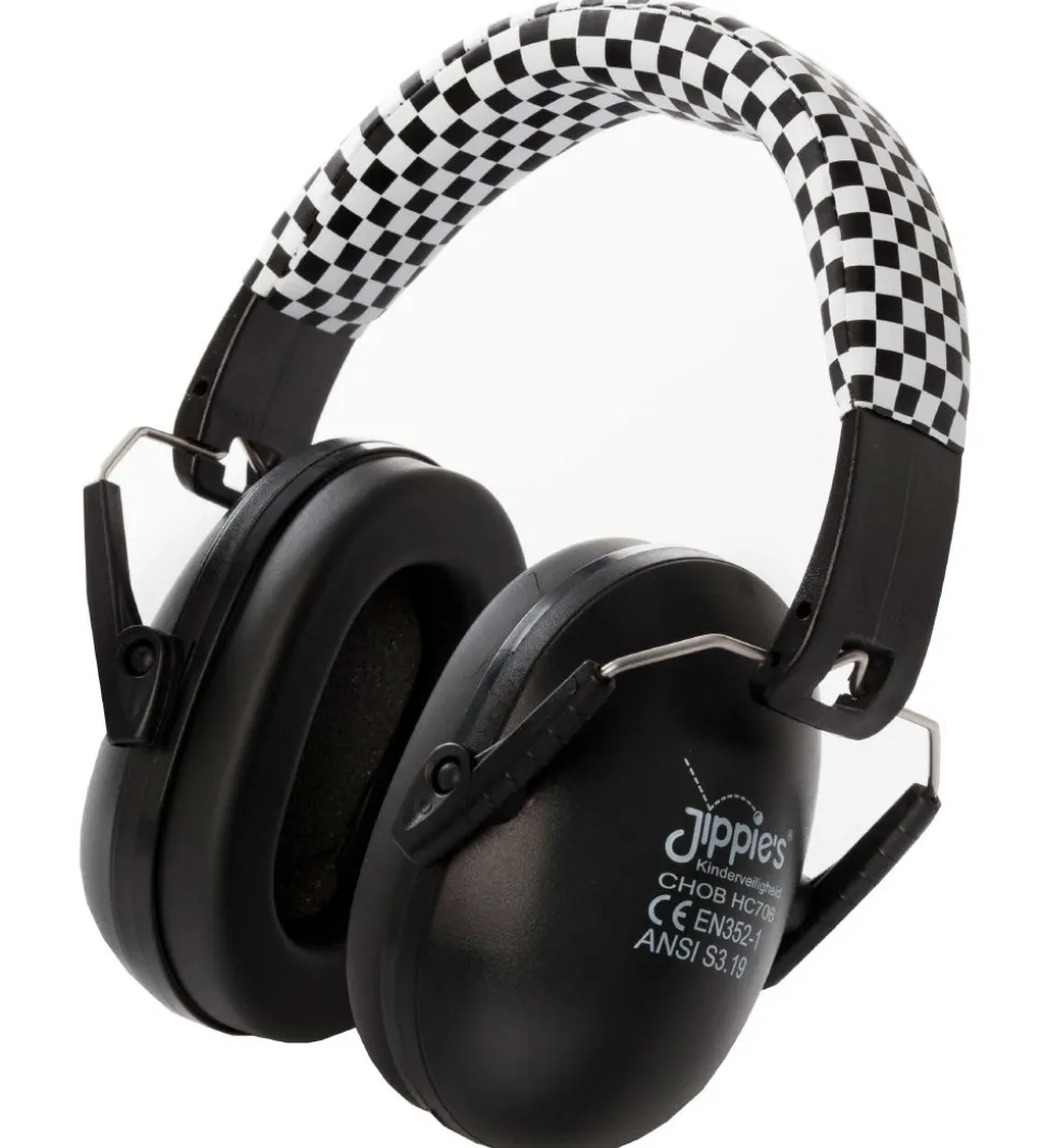 Praktiske Jippies høreværn i sort, med et ternet bånd i sort og hvid.