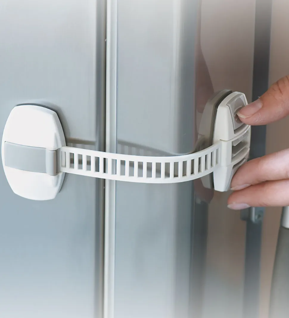 Jippies klemmelåsen monteres med det medfølgende dobbeltklæbende tape, og den åbnes ved at klemme sammen på selve låsemekanismen. Denne lås skal monteres på glatte overflader, og den er velgnet til f.eks. køleskabet, toiletbrættet eller et skab.