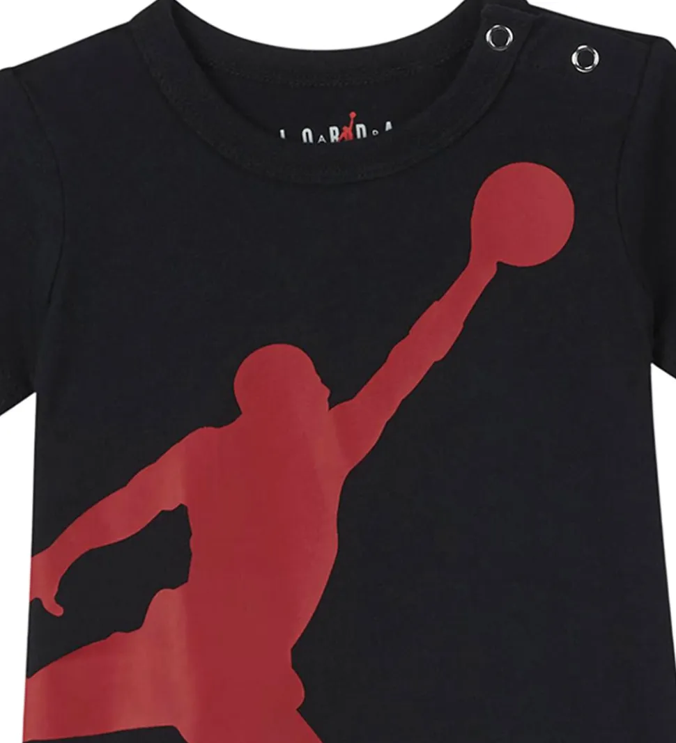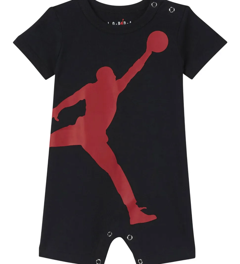 Smart Jordan sommerdragt i sort med et ikonisk, rødt silhuetprint af en basketball-spiller. Sommerdragten kan åbnes med trykknapper over venstre skulder og mellem benene.