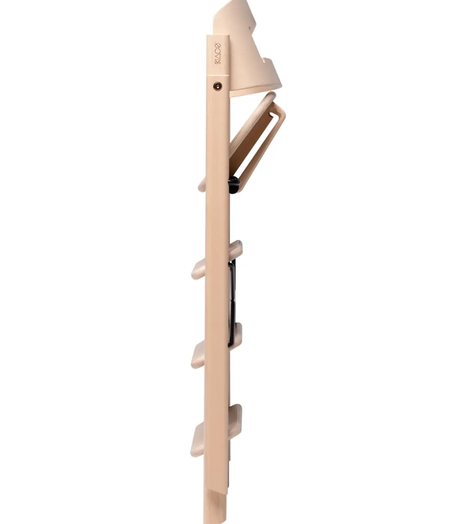 KAOS højstolen har et prisvindende design, da den er udviklet til at lade barnet selv finde sig til rette i den. Foran er der trin, som er inspireret af en stige, og her kan barnet klatre op uden at trinene skal justeres. Højstolen kan let klappes sammen, og den vejer meget lidt, så den er let at flytte rundt på.