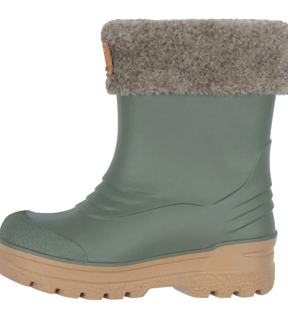 Lækre Kavat gummistøvler i mørkegrøn med en brun kant af uld i toppen og med brune ydersåler.