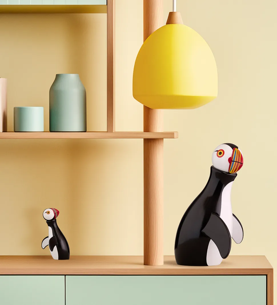 Hyggelig Kay Bojesen træfigur som forestiller en søpapegøje. Figuren er fremstillet i bøgetræ, som er blevet malet i sort og hvid og med et farverigt næb.