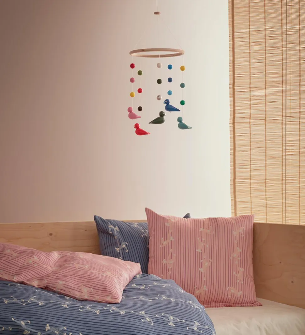 Flot Kay Bojesen uro af træ med farverige vedhæng formet som de kendte sangfugle fra Kay Bojesen.