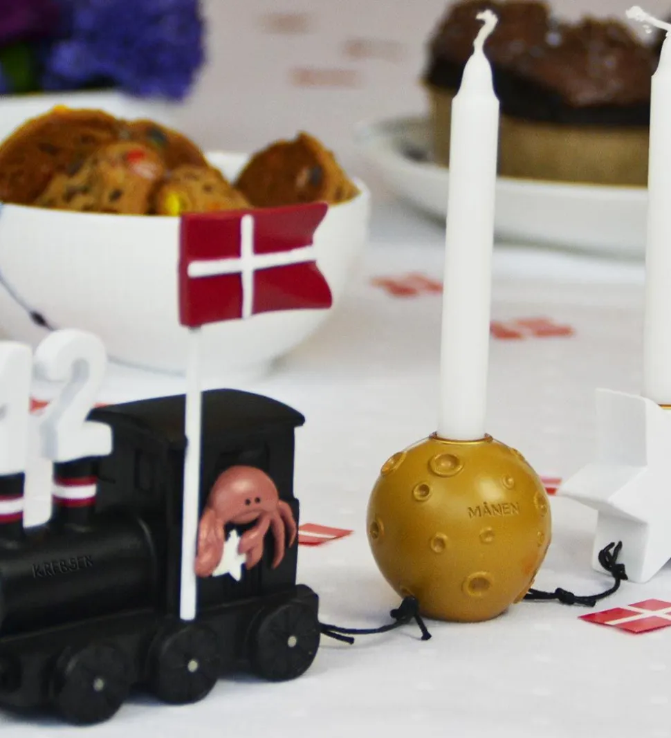 Fødselsdagstogets har plads til to stearinlys i stjernen og planeten, imens tallene og flaget skal placeres på selve fødselsdagstoget.