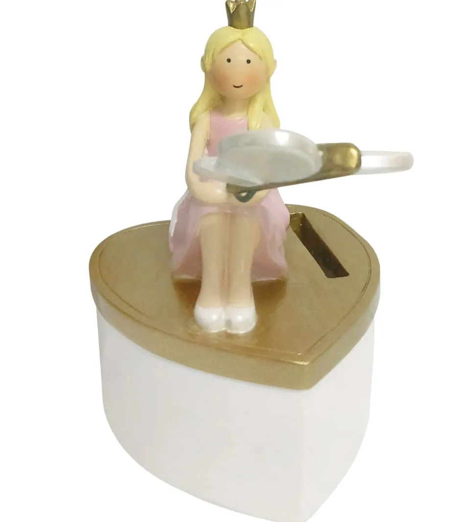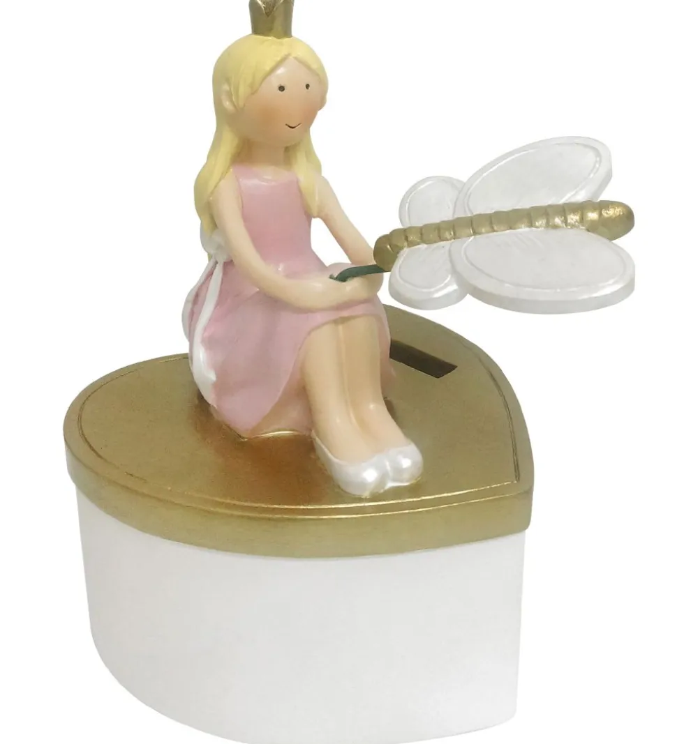 Fin Kids by Friis sparebøsse inspireret af H. C. Andersens eventyr om Tommelise. Selve sparebøssen forestiller en hvid hjerteformet æske med guldfarvet låg. Oven på låget sidder Tommelise med bøjede ben i en fin lyserød kjole og med krone på. Foran hende er en hvid og guld sommerfugl.