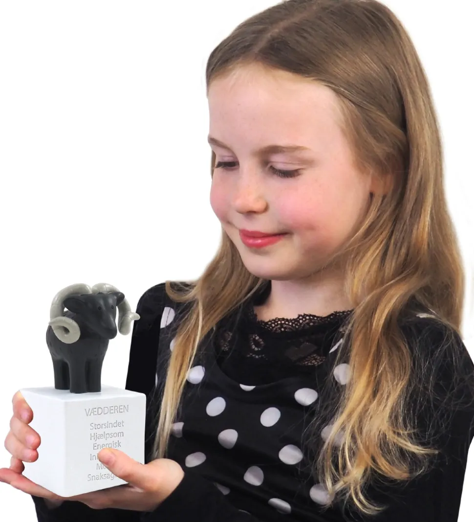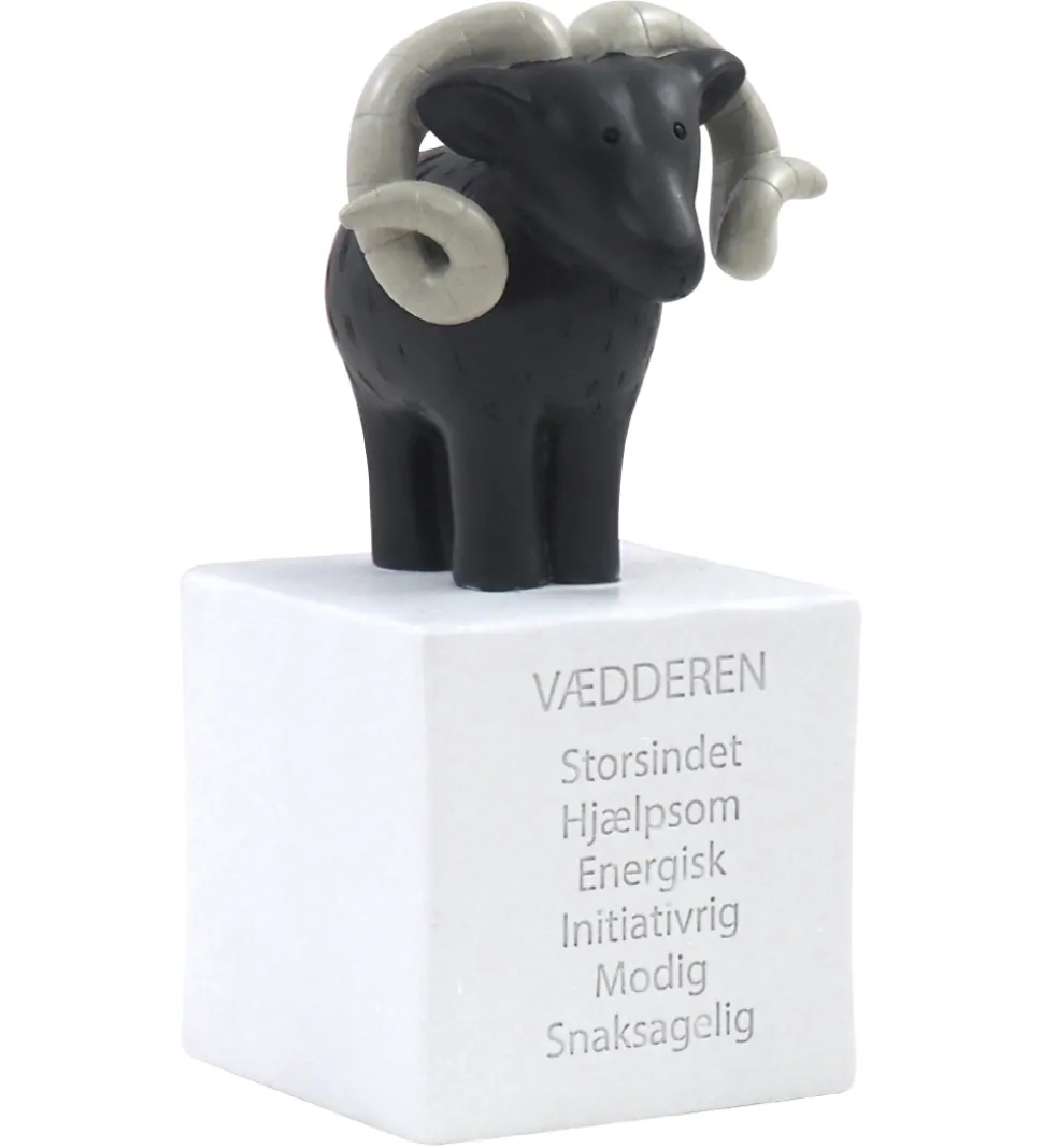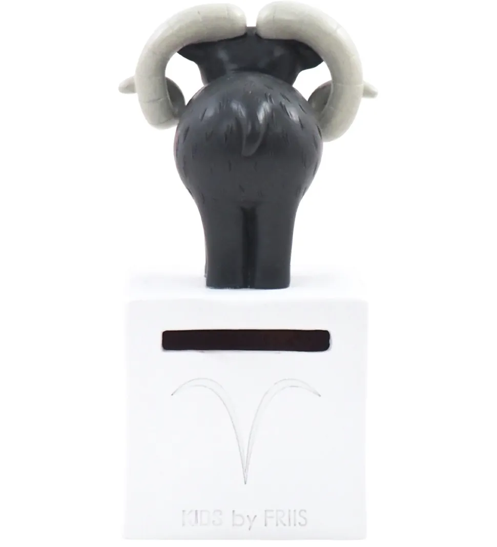Skøn Kids by Friis sparebøsse med stjernetegnet Vædderen. Der er en sød figur af stjernetegnet oven på selve sparebøssen, der er udformet som en hvid kube.