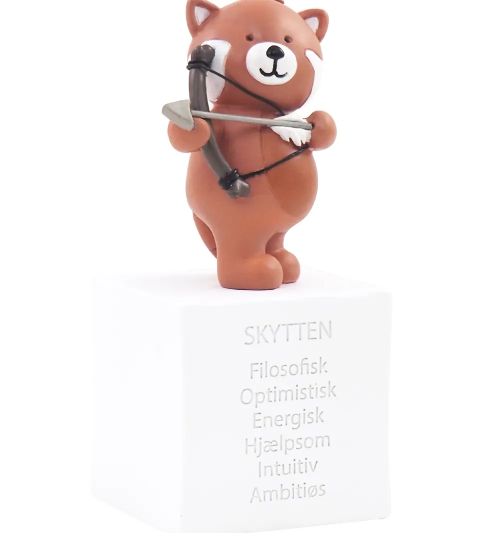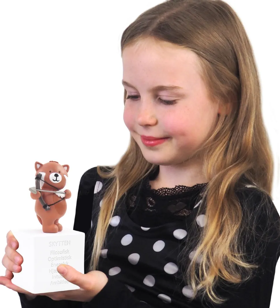 Skøn Kids by Friis sparebøsse med stjernetegnet Skytten. Der er en sød figur af stjernetegnet oven på selve sparebøssen, der er udformet som en hvid kube.