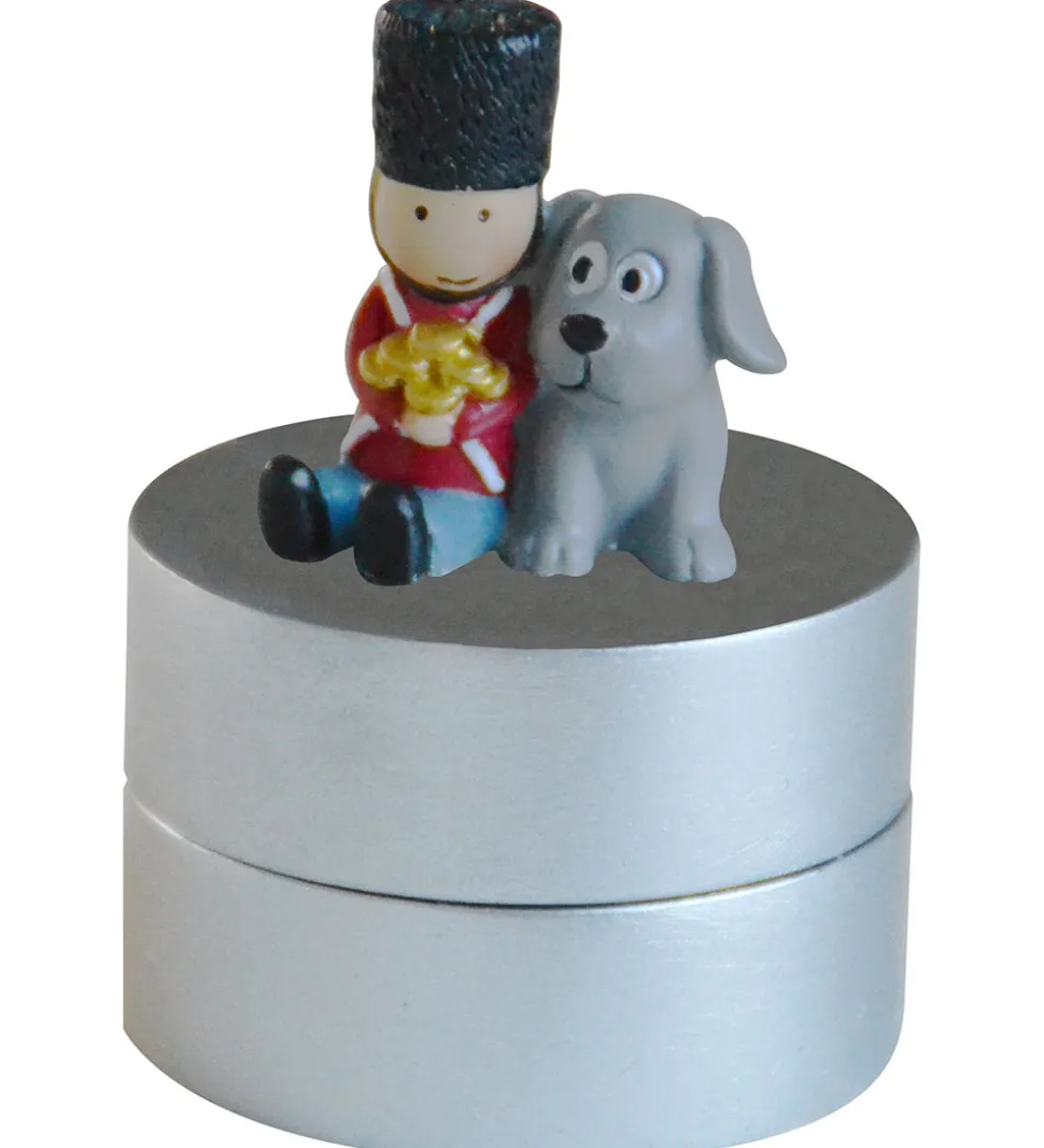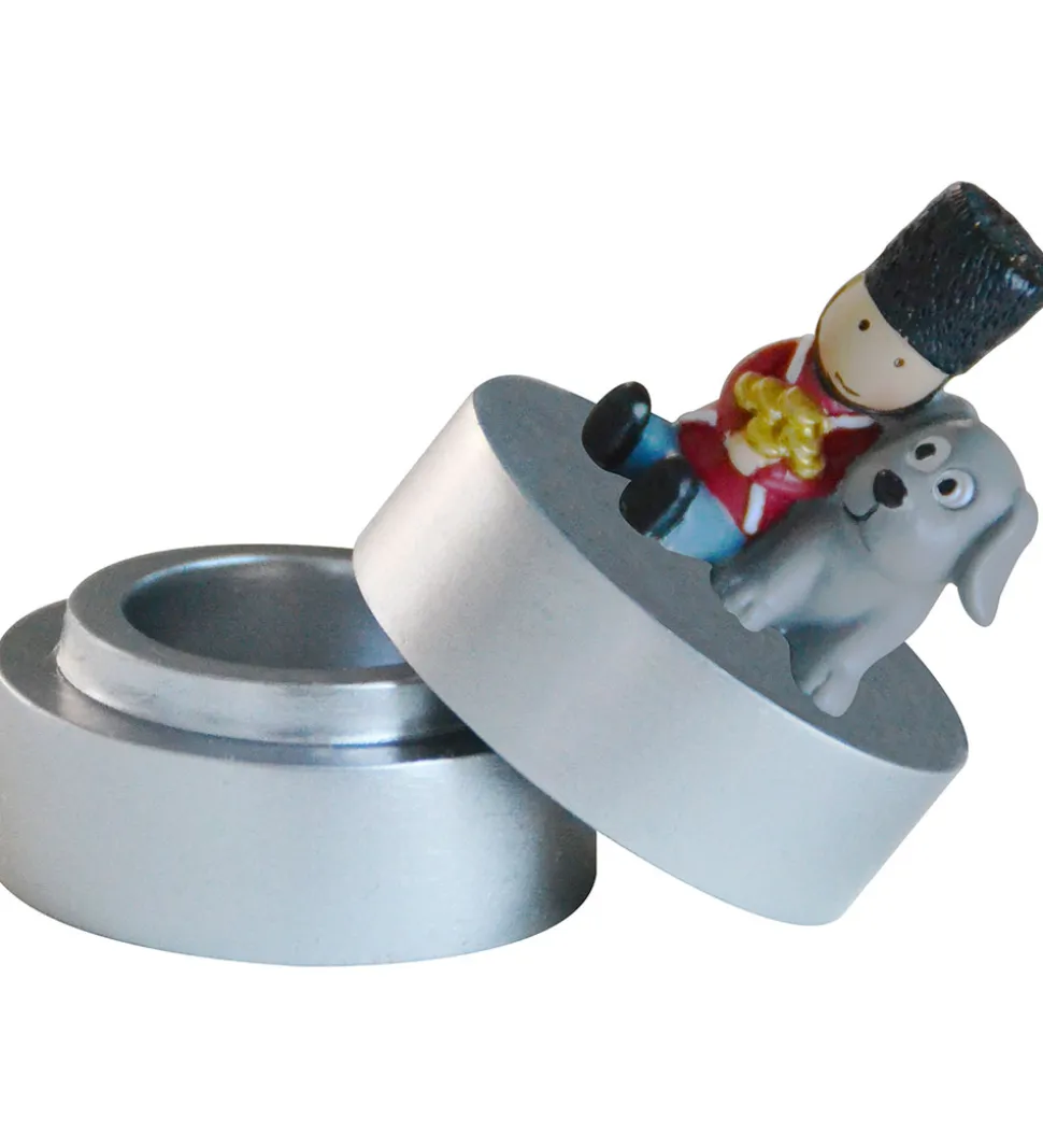 Fin Kids by Friis tandæske i skinnende grå med H.C. Andersens eventyr “Fyrtøjet” som tema. Ovenpå den runde æske sidder der en lille soldat klædt i sin garderuniform med en masse guldmønter i hænderne og en stor, grå hund på låget.