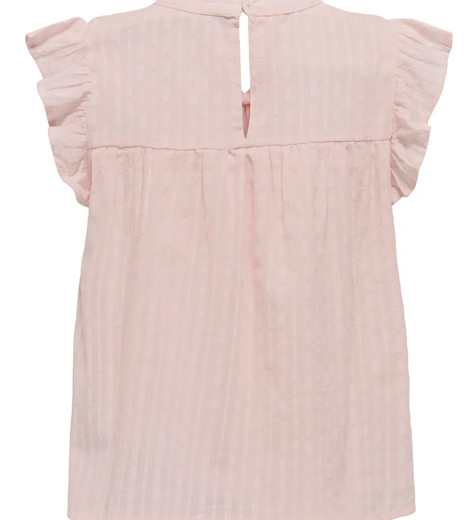 Lækker Kids Only Top med korte ærmer i en lyserød nuance. Toppen har fine rynkedetaljer og en smuk afslutning ved ærmerne, hvilket giver et sødt og dekorativt look til garderoben.