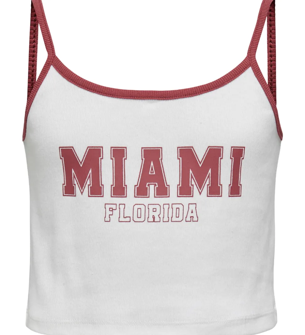 Flot Kids Only top i hvid med bordeaux ribkanter og tekst “Miami Florida” i en markant skrift på forsiden. Kids Only leverer en stilren og enkel tanktop, der nemt bliver en del af garderoben.