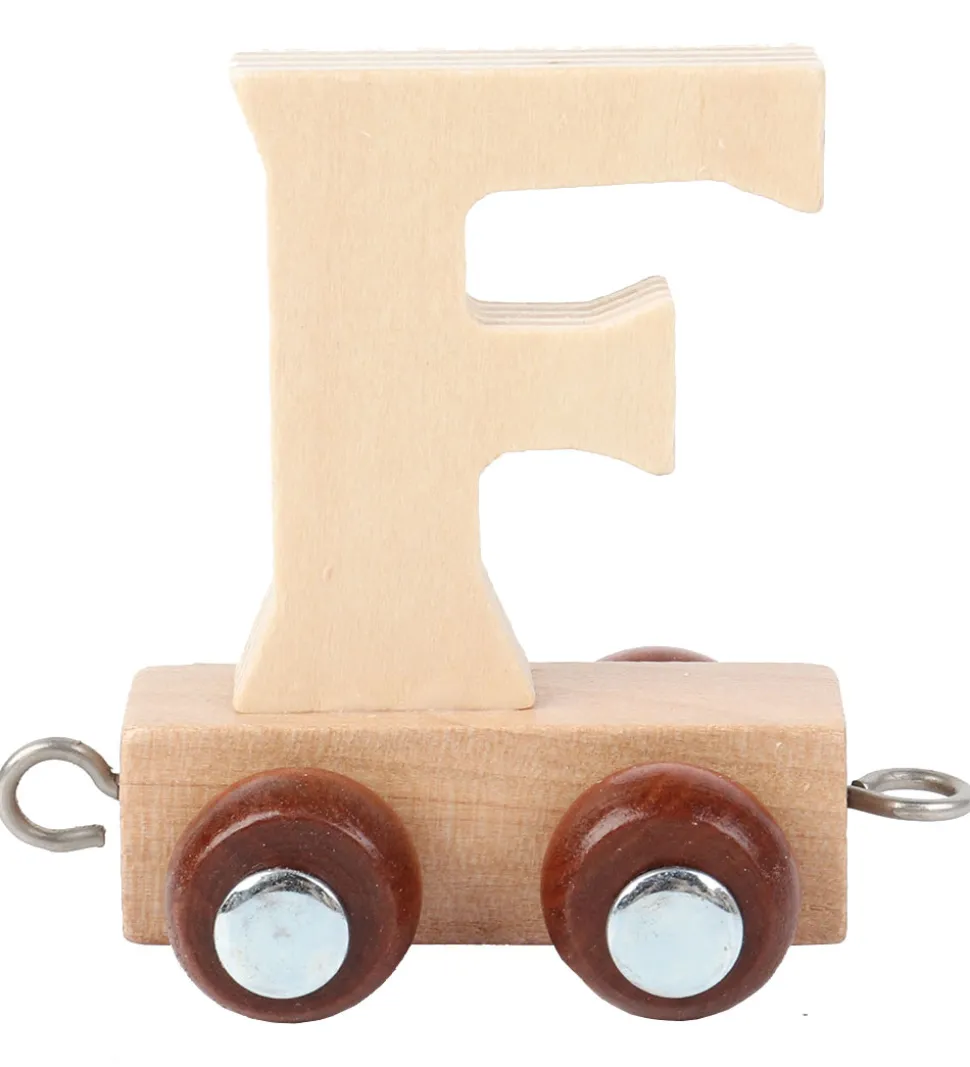 Fin Kinder and Kids navnetog togvogn med bogstavet F i naturligt træ.