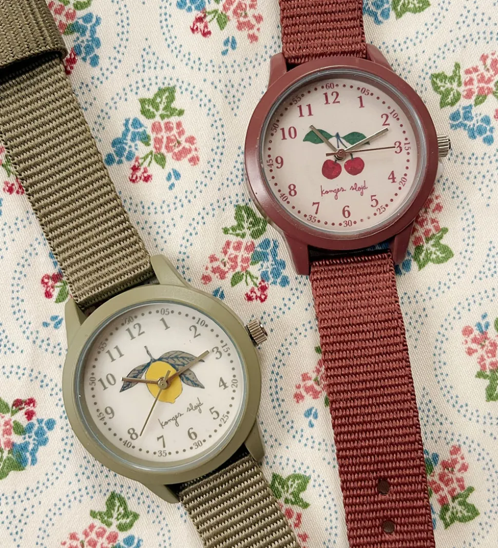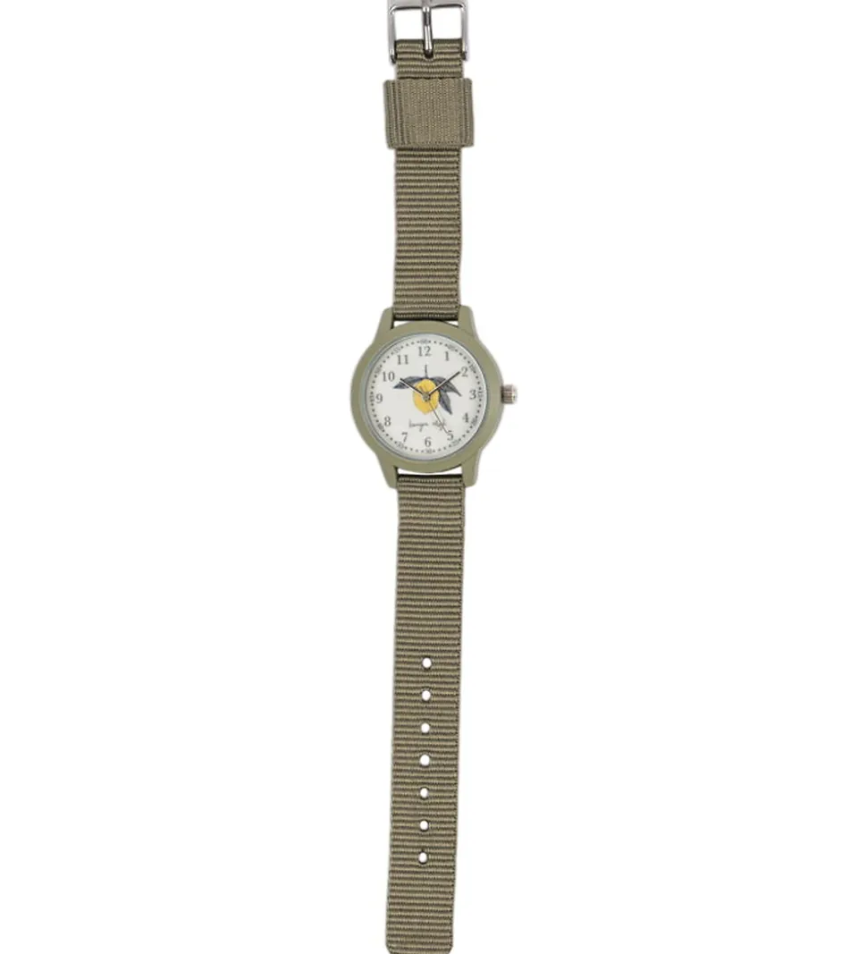 Flot Konges Sløjd armbåndsur i mørkegrønttekstil, og i indeni urkassen er det dekoreret med en gul citron.