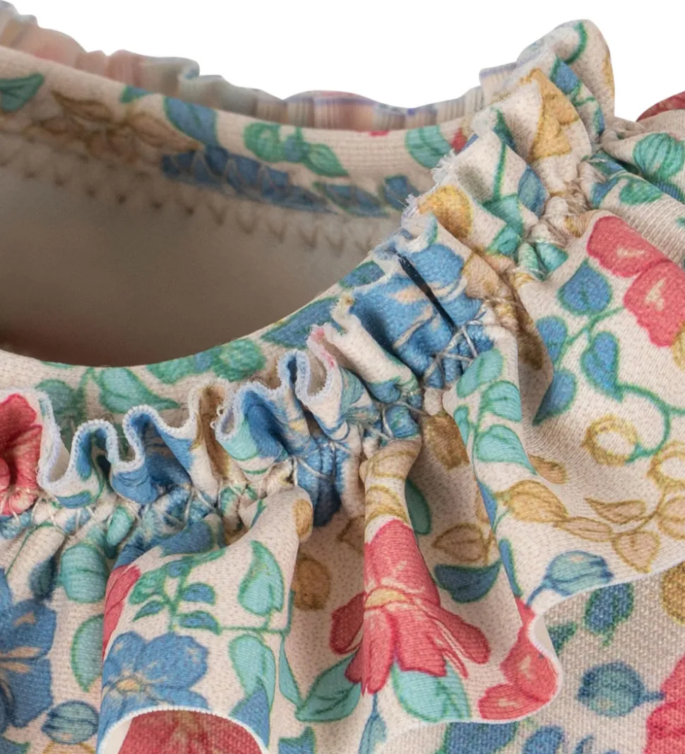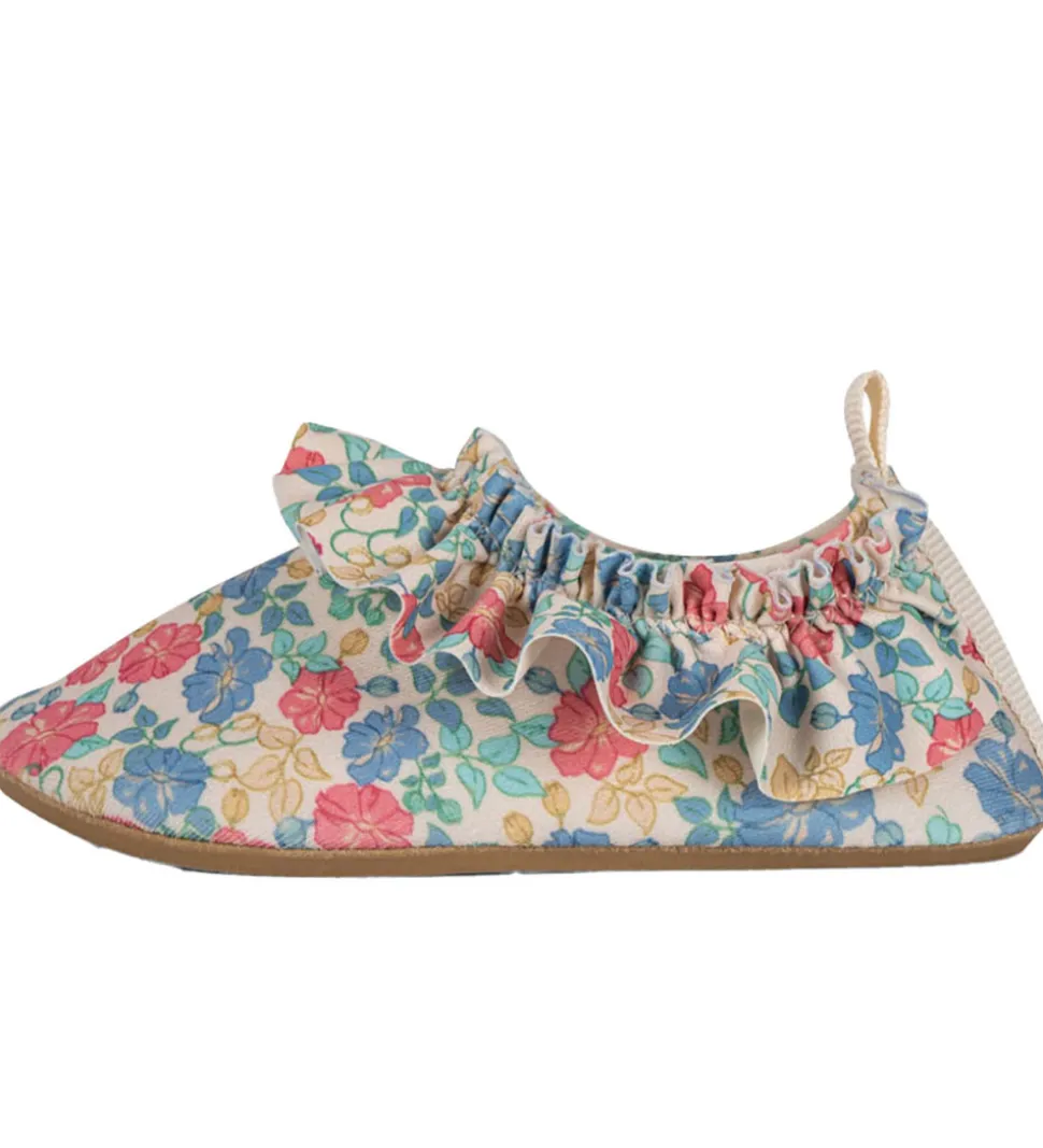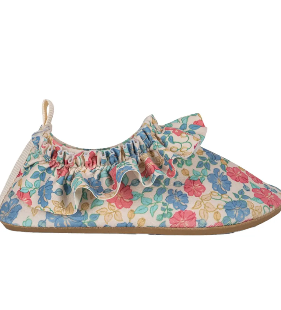 Fine Konges Sløjd badesko i hvid med et farverigt blomsterprint.