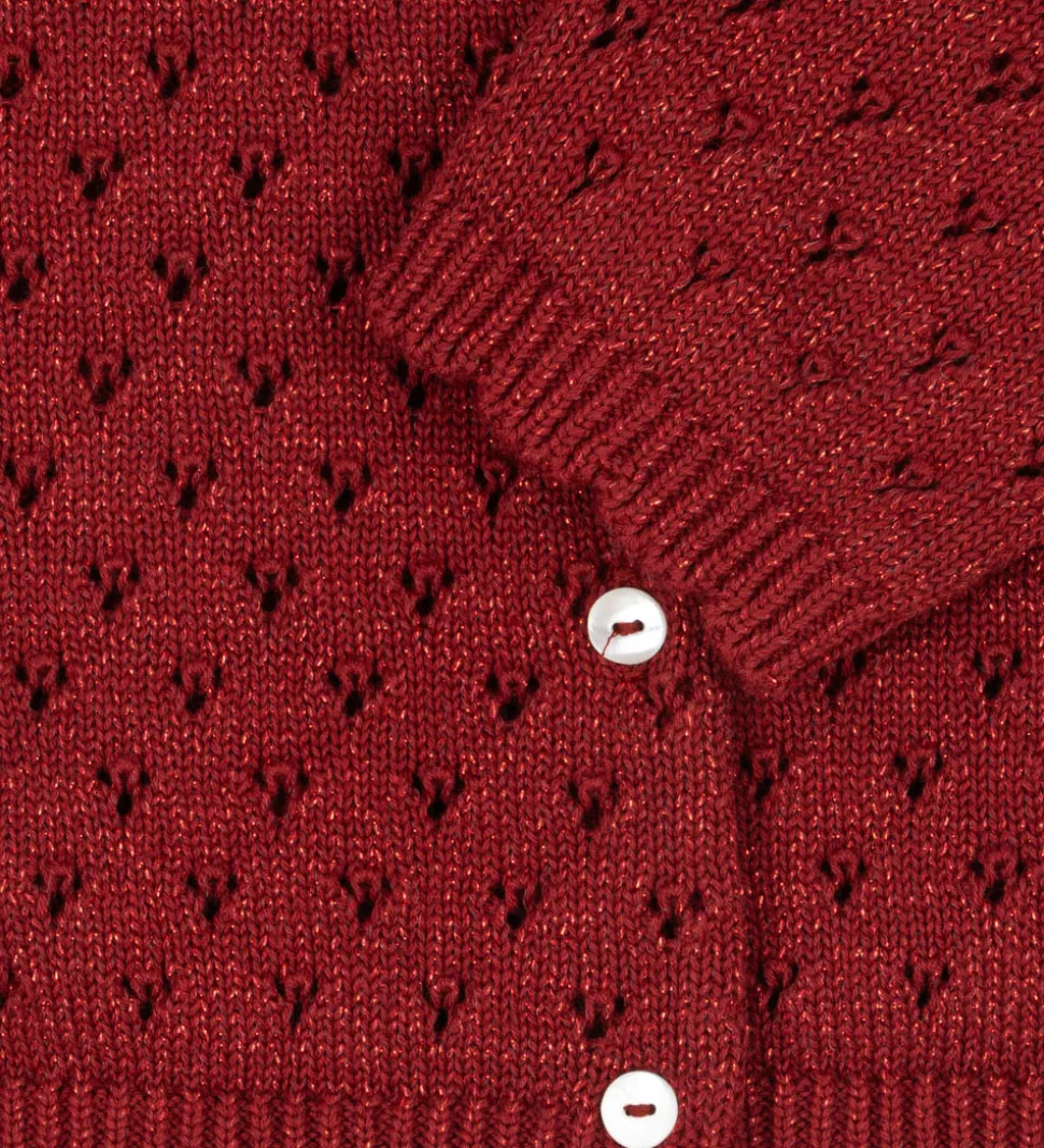Elegant cardigan fra Konges Sløjd i en dyb, rød nuance med glimmer.