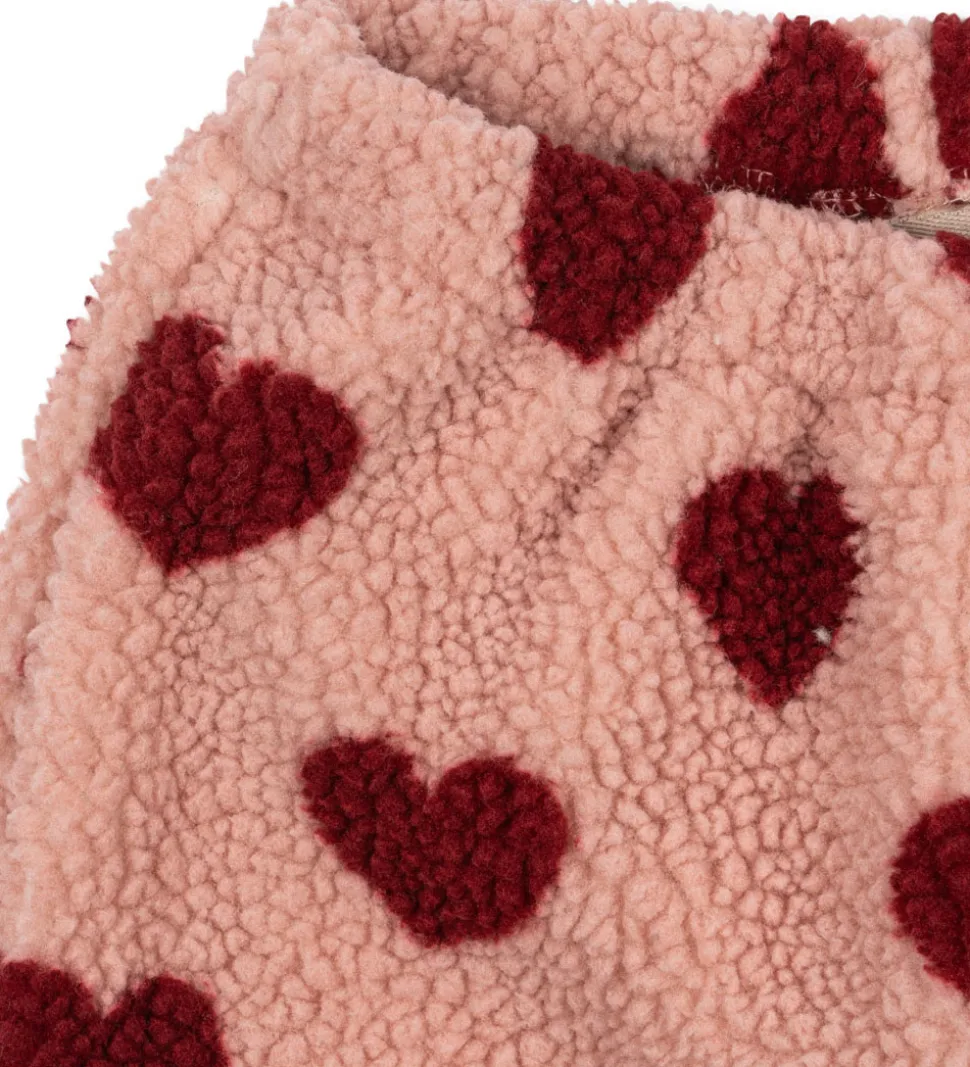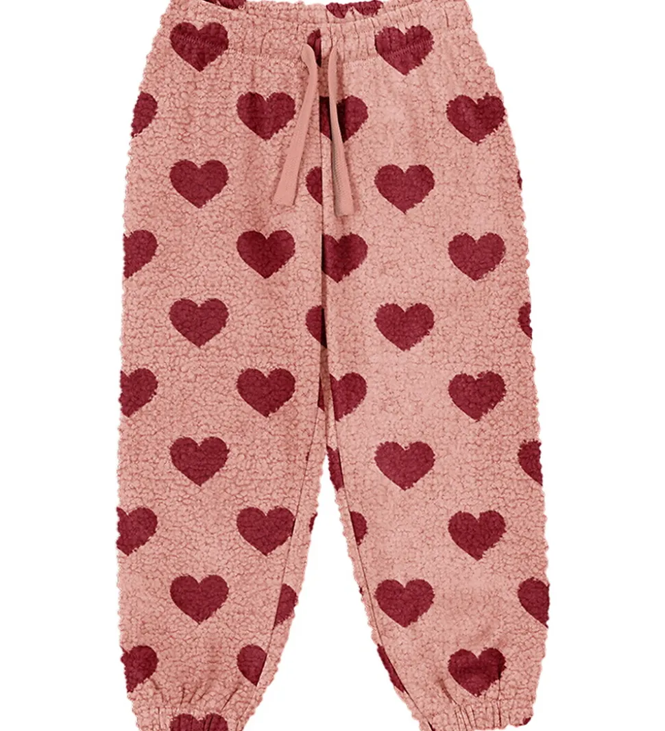 Lækre Konges Sløjd fleecebukser i lyserosa med et charmerende hjerteprint i rød.