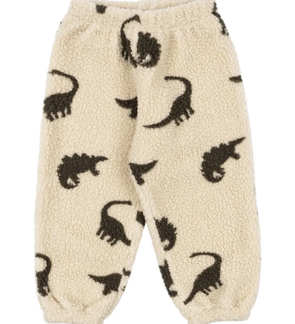 Bløde Konges Sløjd fleecebukser i en varm, cremefarvet tone med et charmerende dinosaurprint i mørkegrøn.