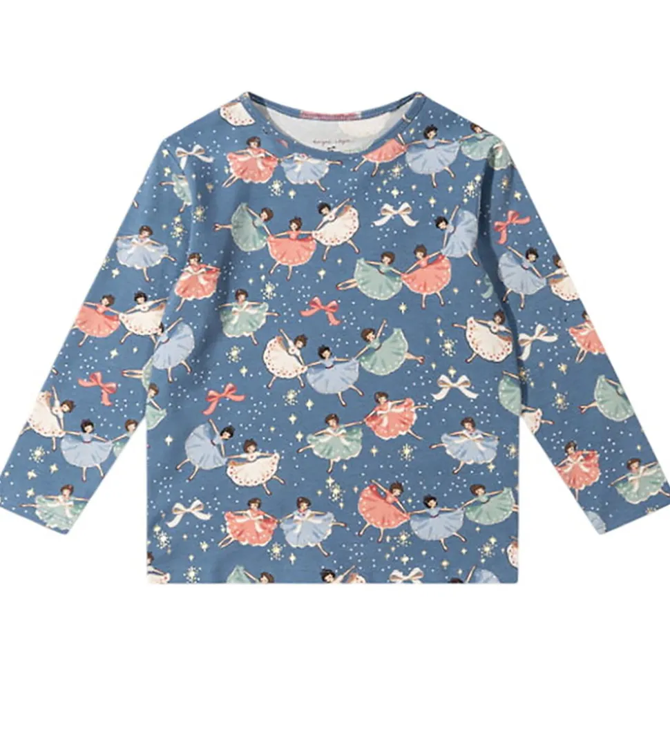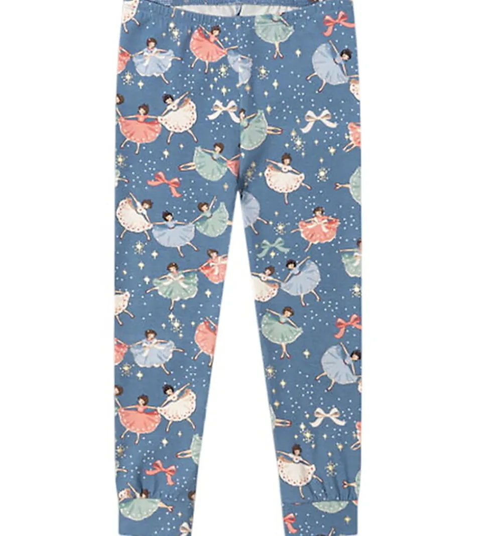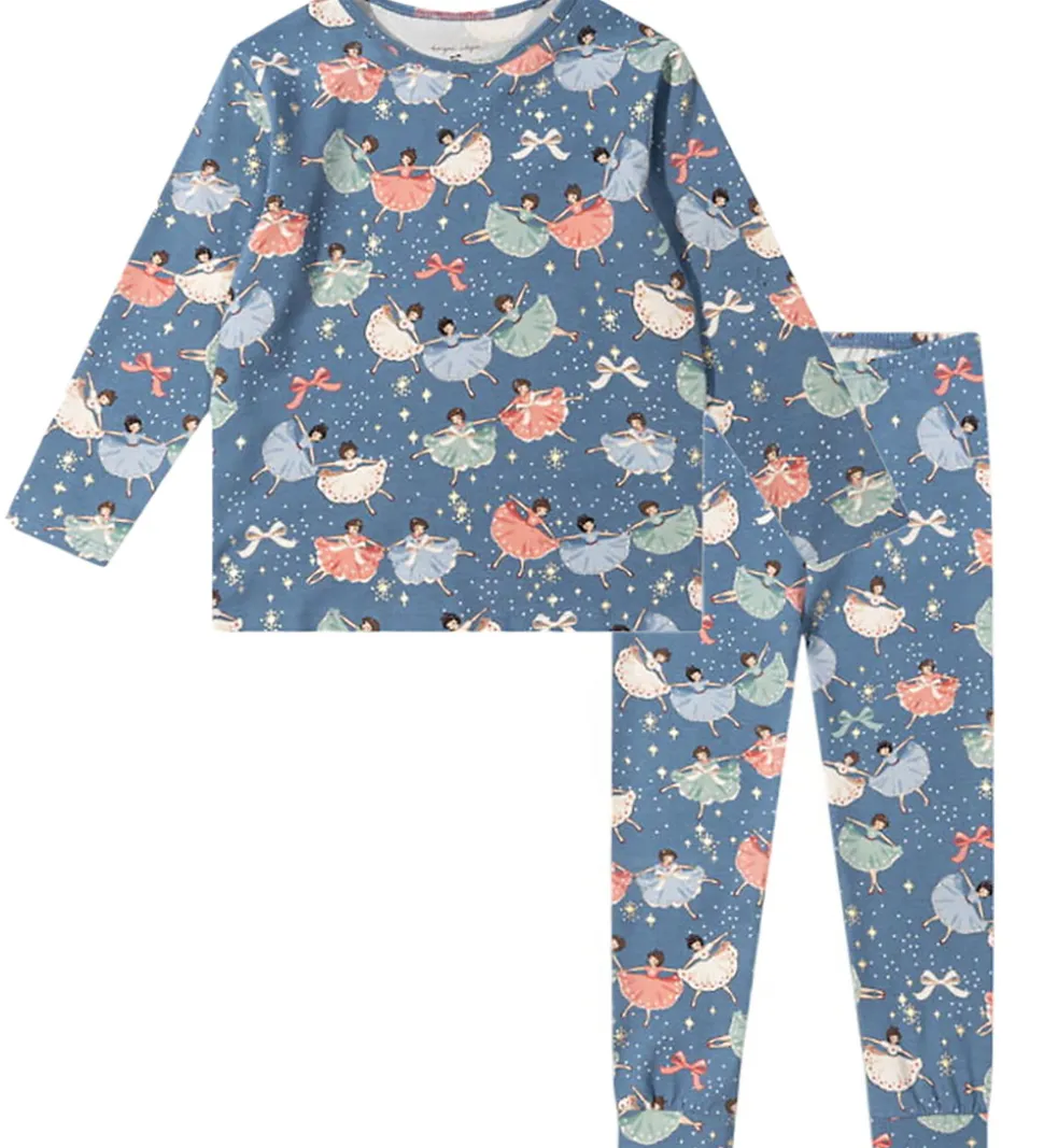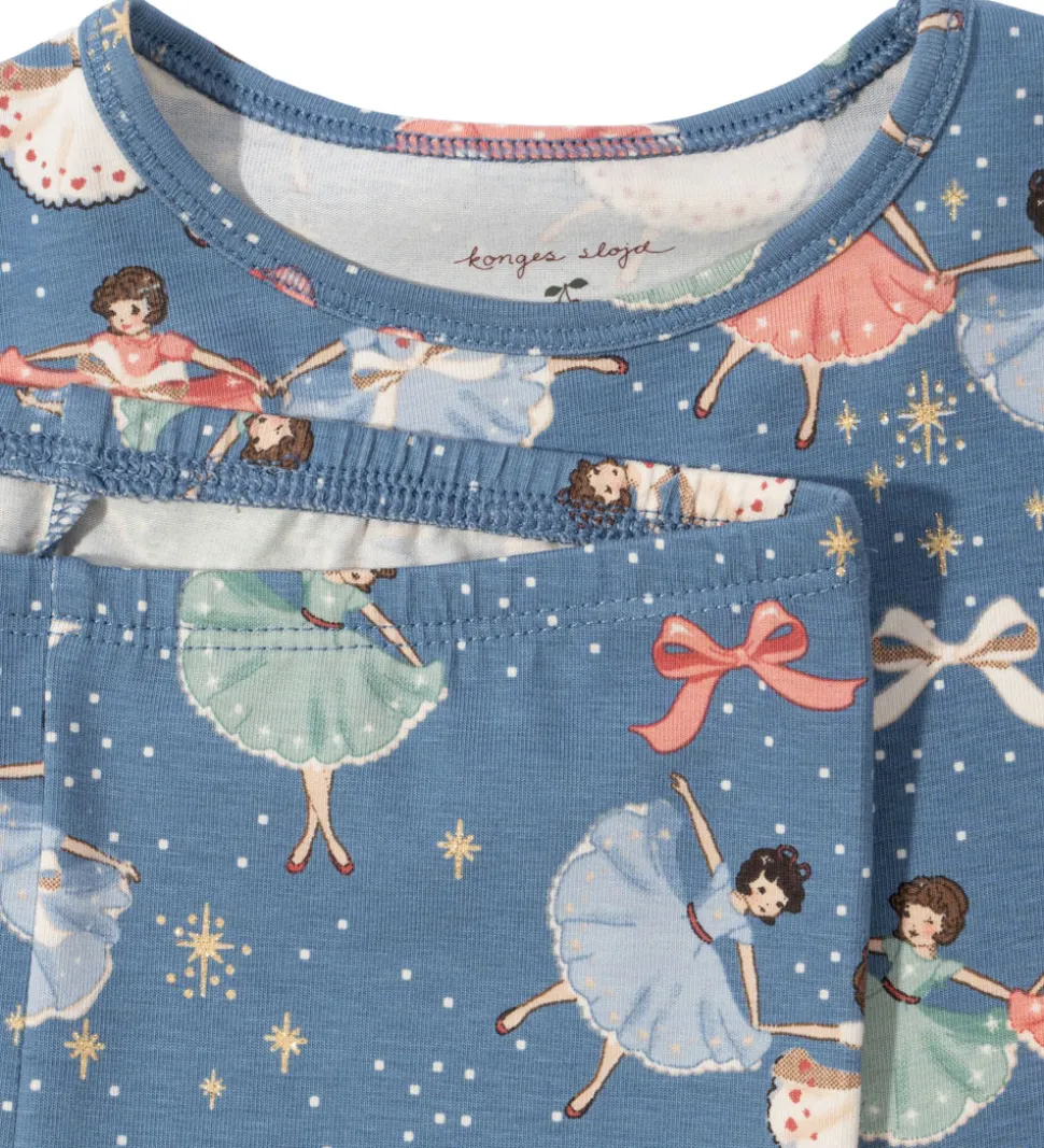 Charmerende Konges Sløjd nattøj bestënde af en natbluse med lange ærmer og et par natbukser med elastisk talje. Nattøjet er i en smuk blå farve med et vidunderligt og farverigt print af dansende ballerinaer, som giver et magisk udtryk.
