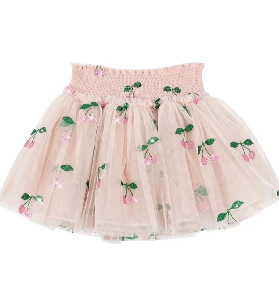 Smuk Konges Sløjd nederdel i en lyserosa nuance pyntet med yndige kirsebærbroderier med glimmer. Nederdelen har en elastisk talje og en let, luftig tylstruktur, der skaber et elegant look. Konges Sløjd har skabt en fin kombination af design og pasform.