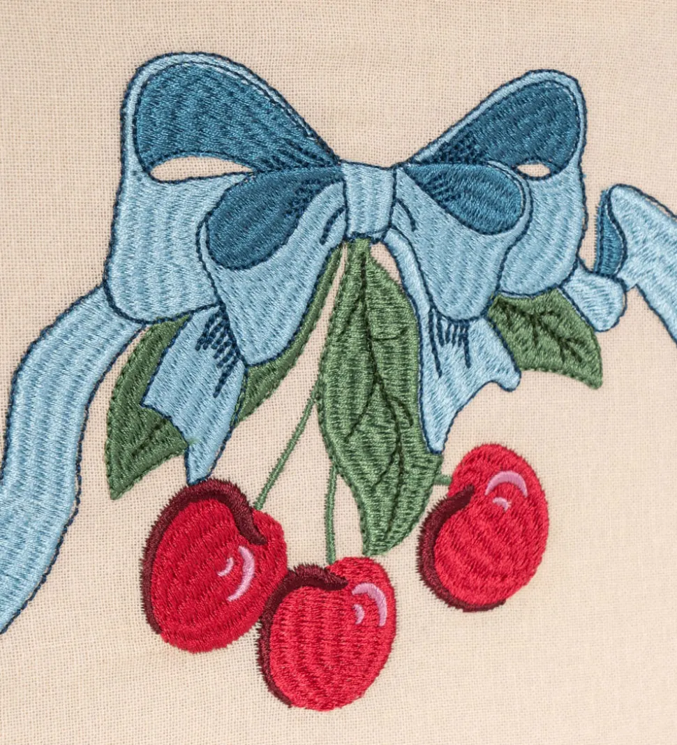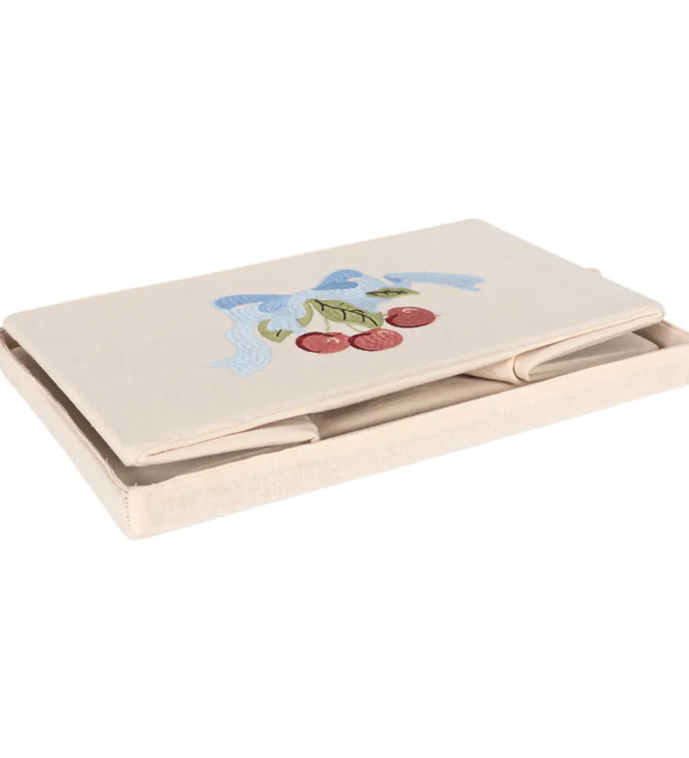 Sød Konges Sløjd opbevaringskurv i en lyserosa nuance og med et flot kirsebær- og sløjfeprint på fronten.