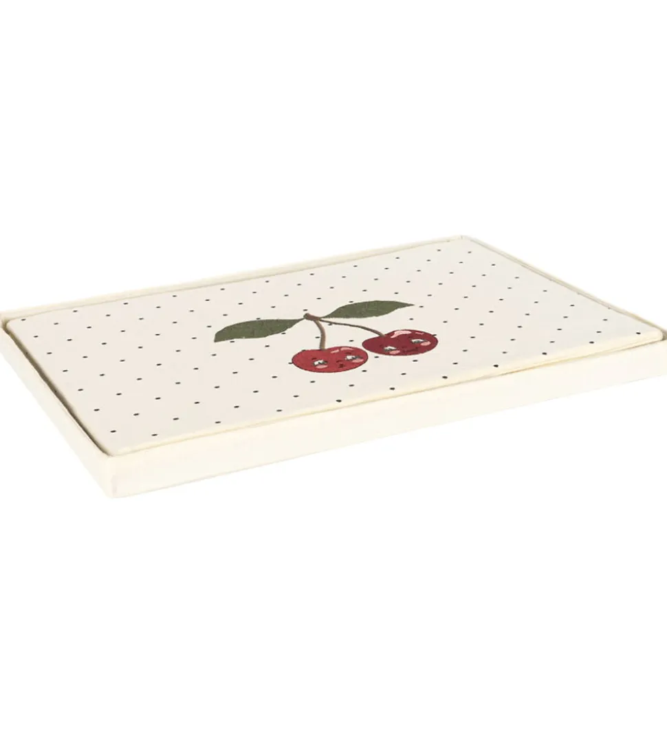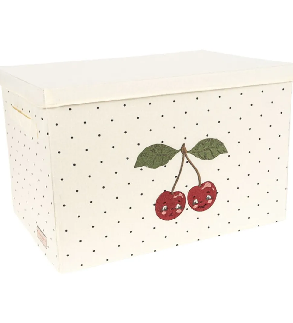 Fin Konges Sløjd opbevaringskurv i hvid med prikker, og på den ene side er der røde kirsebær. Låget er ensfarvet hvidt.