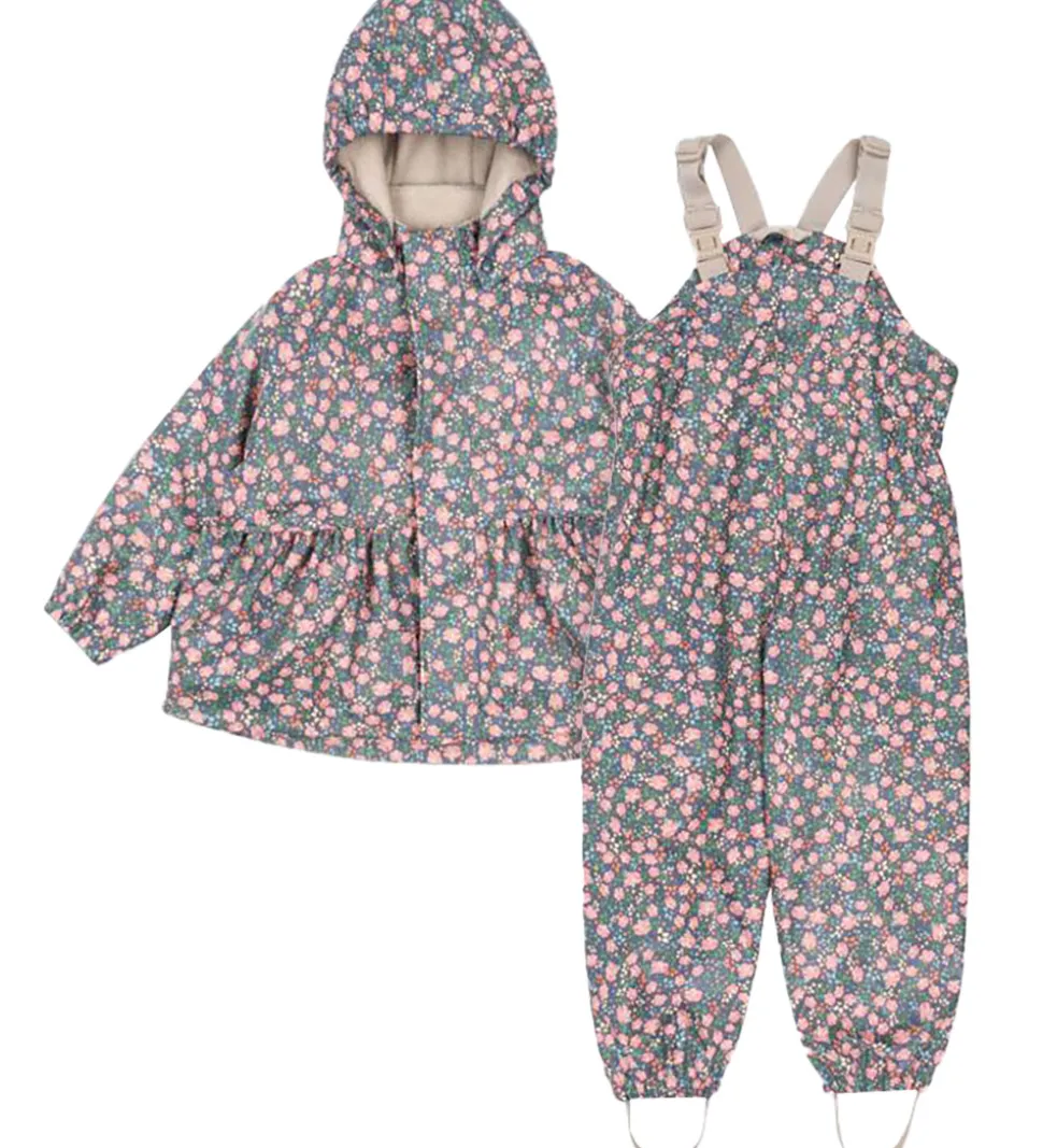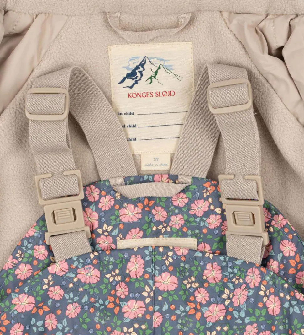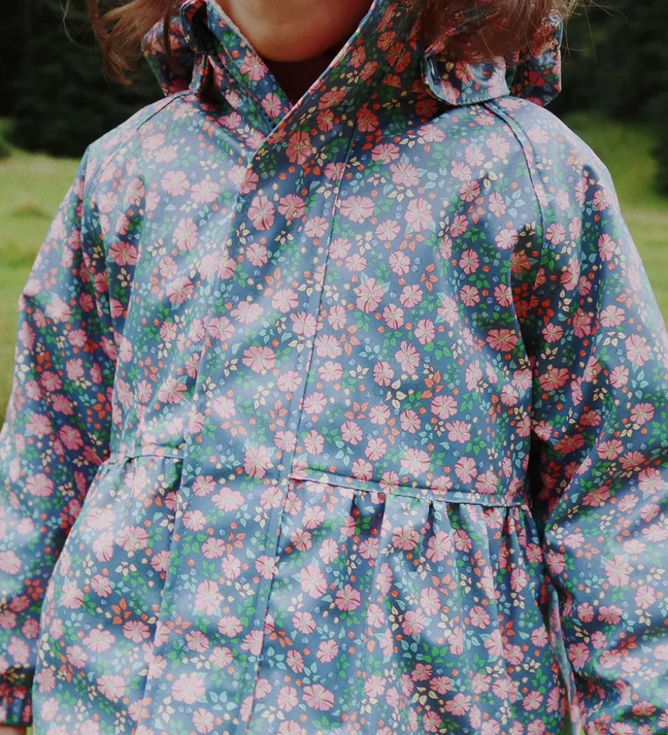 Lækkert Konges Sløjd regntøj af PU i blå med et alloverblomsterprint i rosa, grønne og røde nuancer.