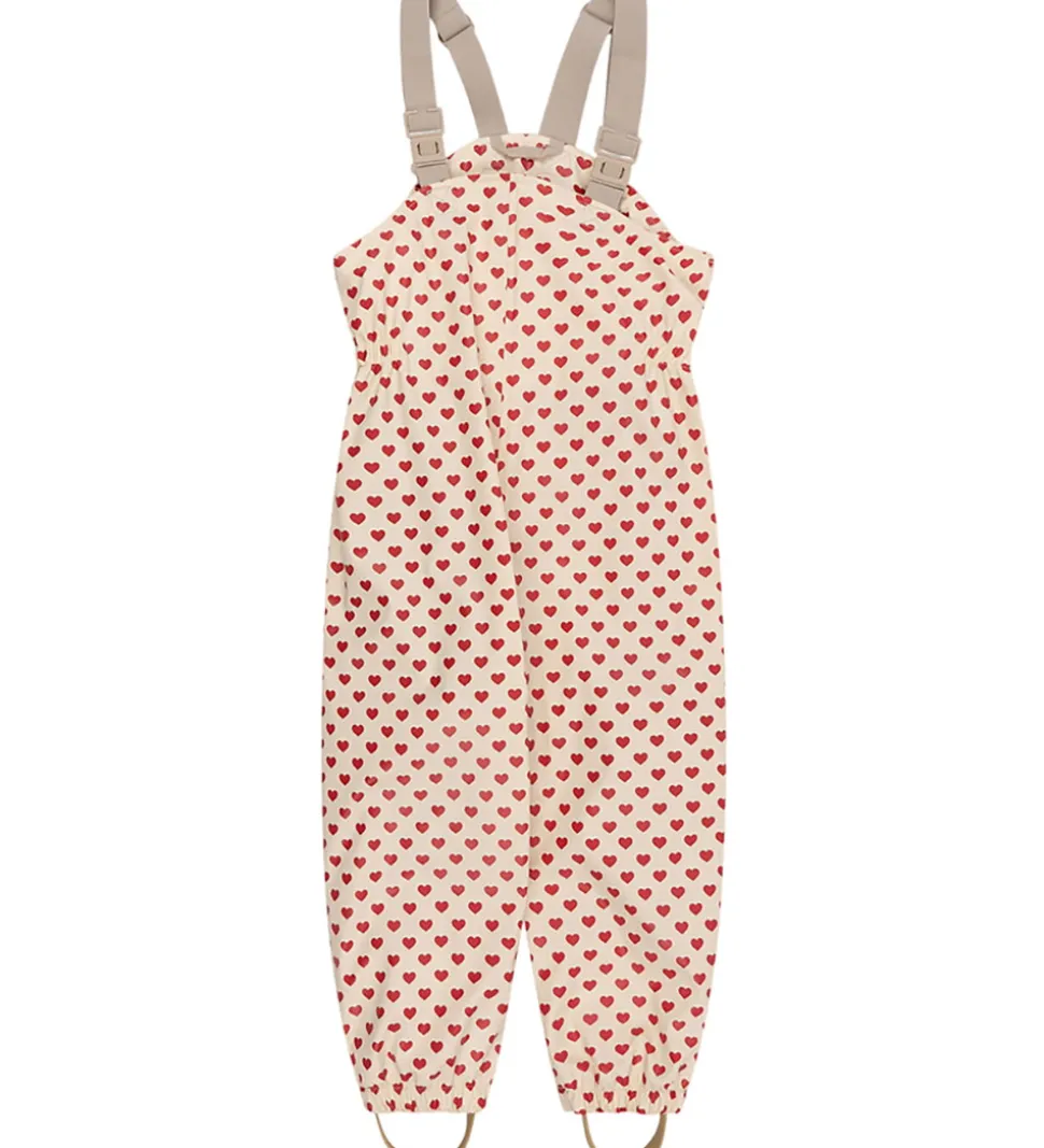 Fint Konges Sløjd regntøj af PU i råhvid med et alloverhjerteprint i rød.