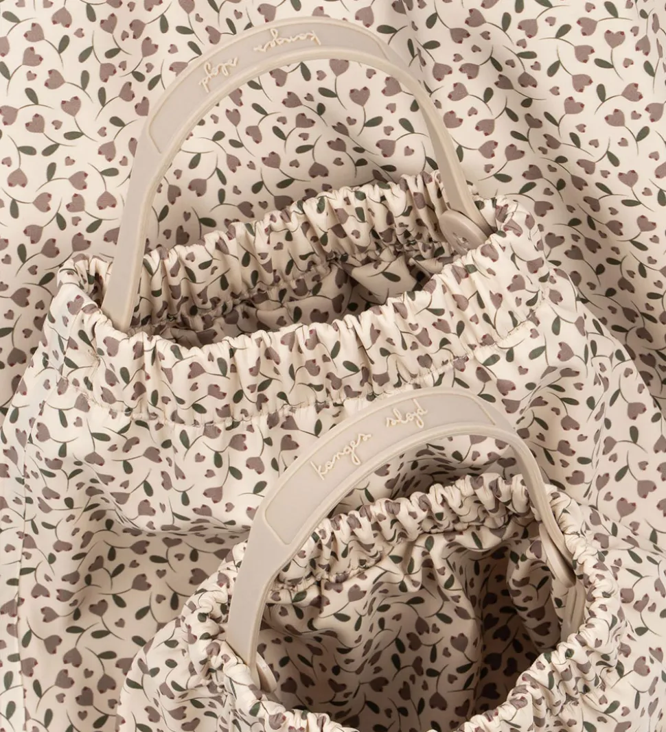 Sødt Konges Sløjd regntøj af PU i lys beige med et alloverprint af små hjerteformede blomster i lilla og grøn.